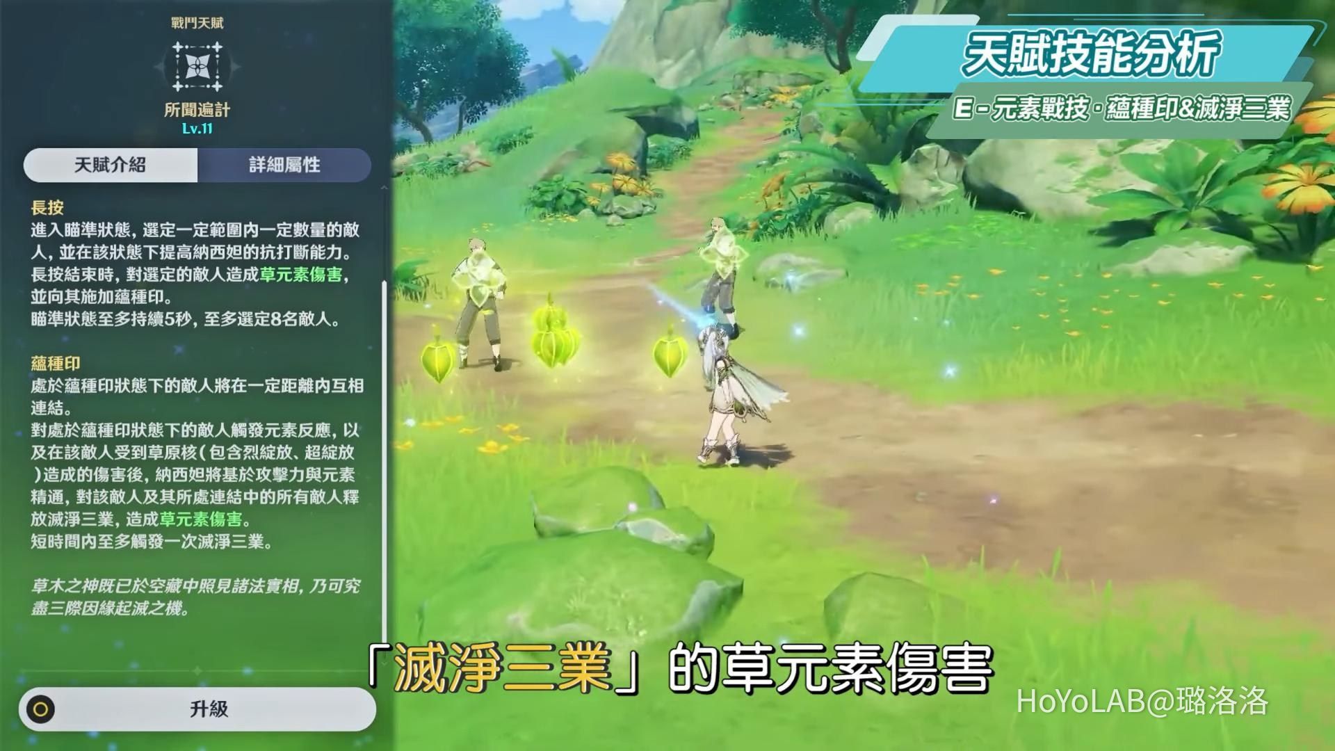被施加上蘊種印的敵人,彼此處於一定距離之下會互相連結,若是對於有蘊種印的敵人造成元素反應,或是敵人受到草原核造成的相關傷害後,會再基於納西妲自身的攻擊力與元素精通,對敵人再次造成一種名為「滅淨三業」的草元素傷害,這個連鎖反應只要命中其中一個敵人,就會連同其他敵人也會一同受到傷害,假如草原核剛好生成的位置不是在那麼中心的話,只要炸到邊緣的敵人,就會連同其他被連結的敵人一起承受傷害,增加傷害的同時也提高綻放隊草原核位置的觸發成功率,而滅淨三業的連鎖傷害也會遵循前面提到的元素附著攻擊間隔的機制,在每次間隔期間敵人最多只會受到一次滅淨三業傷害。此外也要注意的是,元素戰技命中敵人時並不會產生元素微粒,而是要在滅淨三業對敵人造成傷害時才會產生3顆草元素微粒,冷卻時間7秒,持續時間25秒內最多可以產生9顆草元素微粒,而每次滅淨三業傷害皆可以使敵人被施加中草元素附著,是一個全新的附著量,介於強草與弱草之間。