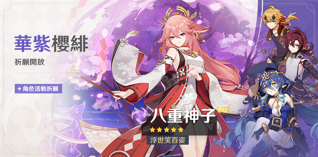 「華紫櫻緋」祈願:「浮世笑百姿·八重神子(雷)」機率UP!