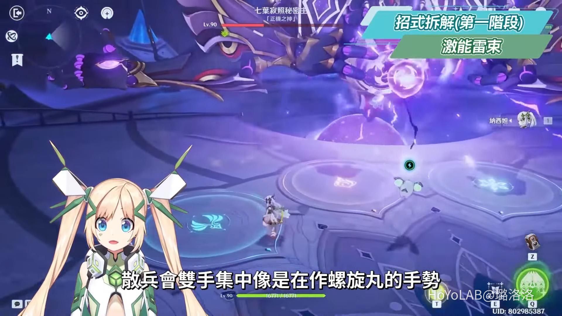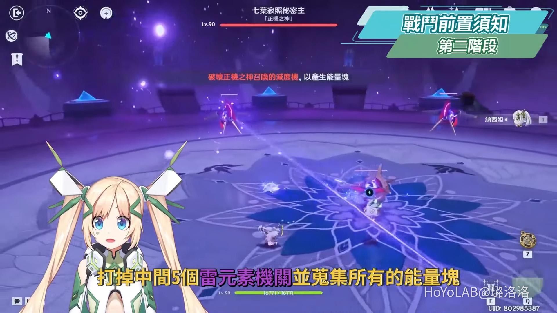來到第二階段後,正機之神會出現一條護盾條,進入到場地後虛空終端會自動攻擊持續破盾,但如果要一次大量消除護盾值的話,就要蒐集場地上的能量塊充滿虛空終端,這一階段的能量槽要充滿的話需要雙倍的能量塊,也就是2個大能量塊或是4個小能量塊,而雖然所需能量塊加倍,場地也變得更大,但可以透過四葉印來快速靠近能量塊蒐集,並在能量槽滿時釋放虛空終端的大招對護盾造成大量傷害,而當護盾值清掉後,正機之神會進入一段類似集氣準備施放元氣彈的狀態,此時虛空終端能量槽會清空,需要在正機之神集氣完的30秒內,打掉中間5個雷元素機關並蒐集所有的能量塊,再將大招打向正機之神才能中斷其元氣彈,若沒有在時間內中斷的話,正機之神大招打下來是必死技,類似雷電將軍的必殺招,真的很愛**欸你~而若成功中斷正機之神的必殺招,就能使其進入癱瘓狀態,並且可以再透過場上的2個四葉印移動到正機之神的胸前,此時所有角色的大招能量也會瞬間充滿,就能趁這段時間盡快了結他,而如果來不及給他最後一擊,則會再進入第二階段的輸出模式,但此時正機之神就沒有護盾,因此可以趁空檔靠近正機之神進行輸出,或是單純靠走位閃招,其他交給虛空終端輸出耗掉血量即可。