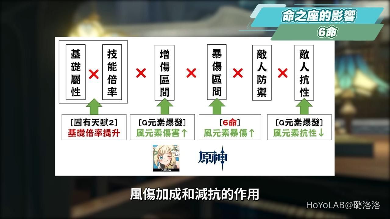 這邊也再補充一下關於6命的加成效果,可以看到0命的琺露珊在0命就能提供基礎倍率、風傷加成和減抗的作用,但解鎖6命後的暴傷乘區可以再讓傷害用「乘」的上去加總傷害,因此只要你用魈,原本開大後一下戳3~4萬,現在搭配琺露珊都可以來到7~8萬。