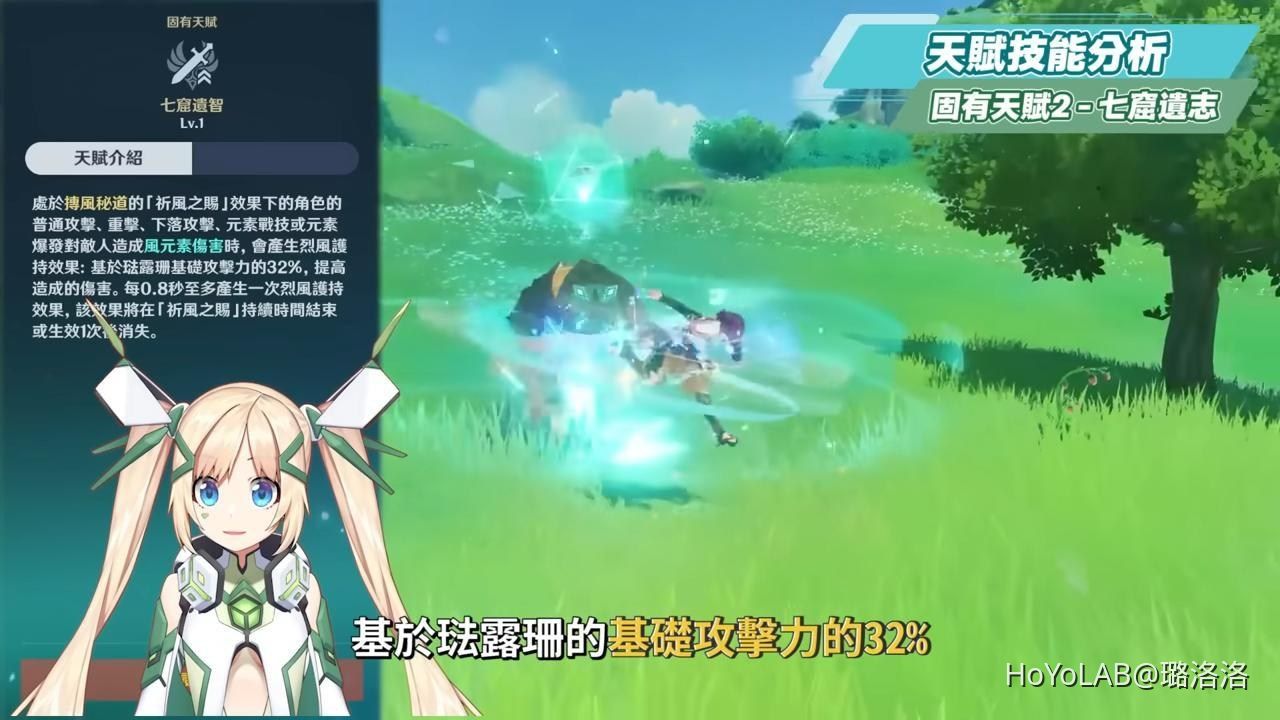 解鎖固有天賦2,會使處於Q大招BUFF之下的角色在普攻、重擊、下落攻擊、戰技或元素爆發對敵人造成風元素傷害時,基於琺露珊的基礎攻擊力的32%,再提高造成的傷害,這邊的基礎攻擊力是類似於班尼特的增傷計算方式,是看武器的基礎攻擊力,以及角色自身面板的白字基礎攻擊力。