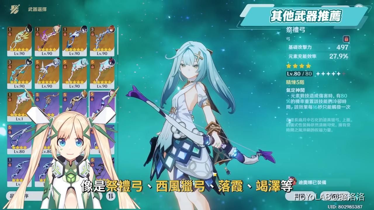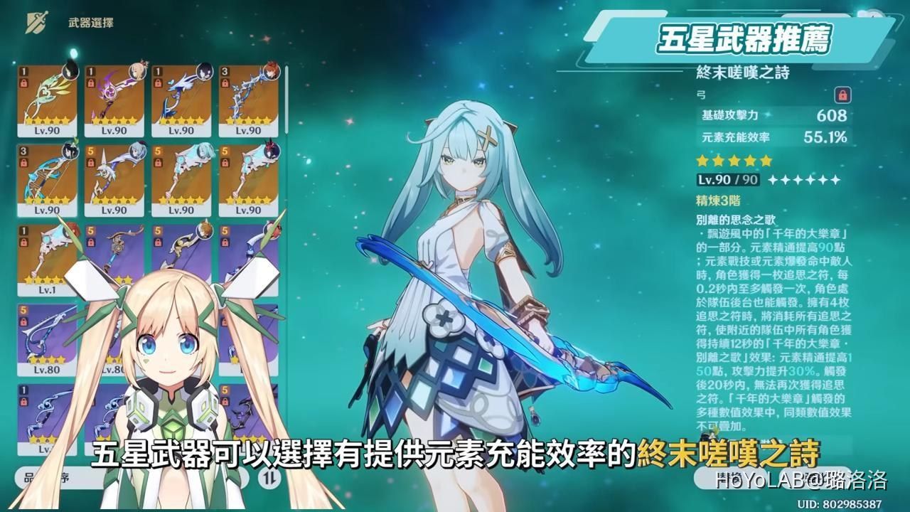 琺露珊的武器跟聖遺物配法一樣,非滿命就是先選充能,滿命可以選有傷害的,五星武器可以選擇有提供元素充能效率的終末嗟嘆之詩,被動還可以增加隊友的攻擊力,其次充能夠的話也可以選擇基礎攻擊力白值高的天空之翼。