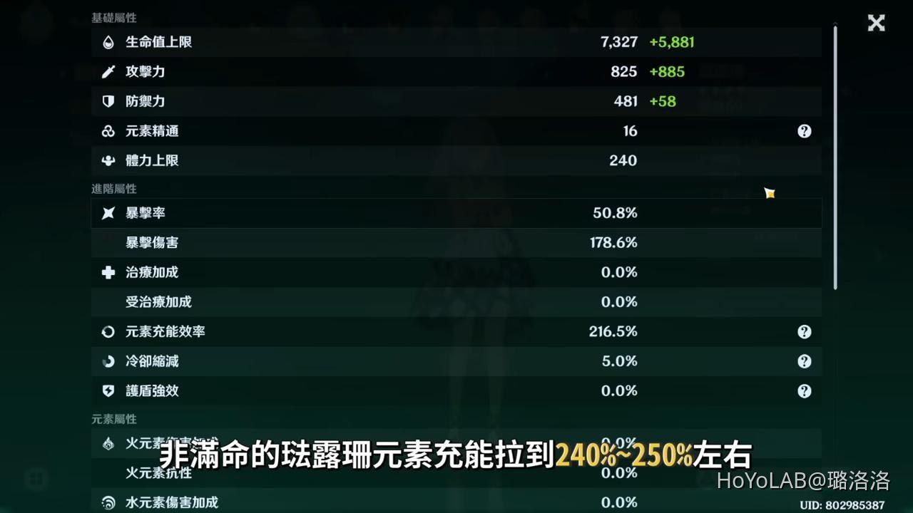畢業面板參考,非滿命的琺露珊元素充能拉到240%~250%,滿命210%左右,達到要求後再去換基礎攻擊力白值較高的武器,用來換琺露珊的輔助作用或是自身的傷害。