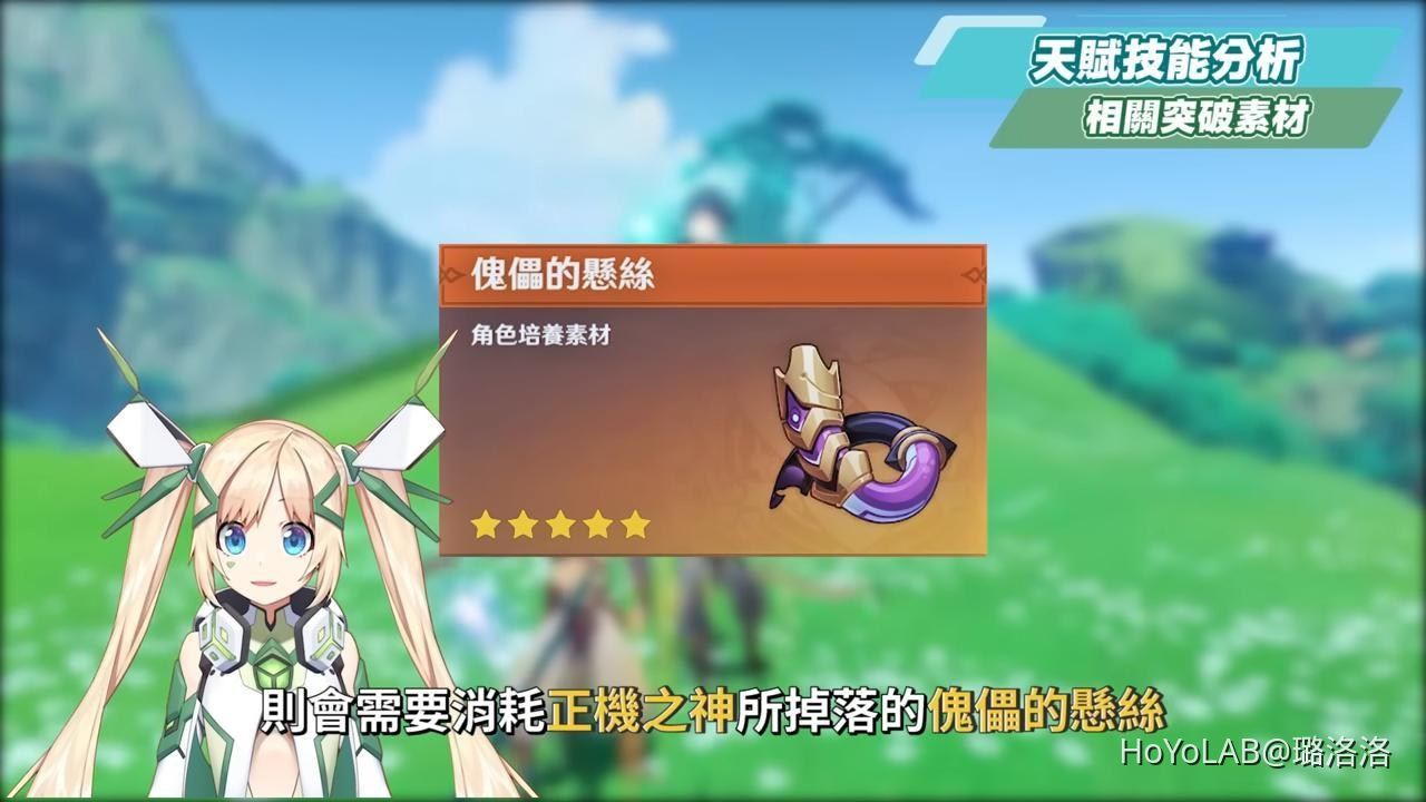 琺露珊的等級突破素材需要**須彌的野外BOSS半永恆統轄矩陣,取得導光四面體,以及須彌特產赤念果,與**鍍金旅團掉落的紅綢,若是要快速採集赤念果和**鍍金旅團的話,也可以參考右上方資訊卡查看效率路線影片。天賦突破素材為周一/四/日開放的諍言系列,若是天賦技能6以上,則會需要消耗正機之神所掉落的傀儡的懸絲。