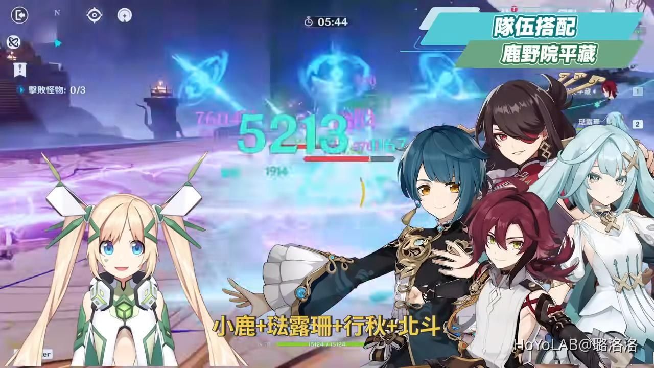 接下來是喜歡玩小鹿主C的組隊陣容,小鹿的能量需求也不算高,又和流浪者一樣是法器角色,所以小鹿的隊伍組法其實和流浪者的差不多,這邊示範的隊伍陣容為小鹿+琺露珊+行秋+北斗,主要是武裝隊的玩法,北斗和行秋提供很好的抗打斷能力,提供小鹿安逸的輸出環境。