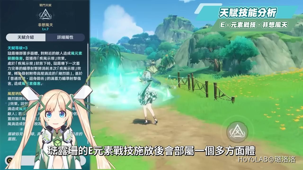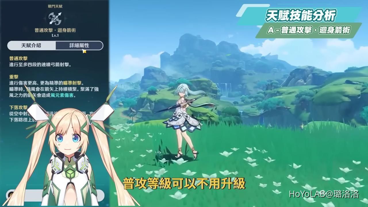 琺露珊的普攻是四段的弓箭連續射擊,但作為輔助角色,普攻等級可以不用升級,普攻會用的時機,主要是在E技能施放後要蓄力射擊使命中位置產生風壓坍縮的作用。