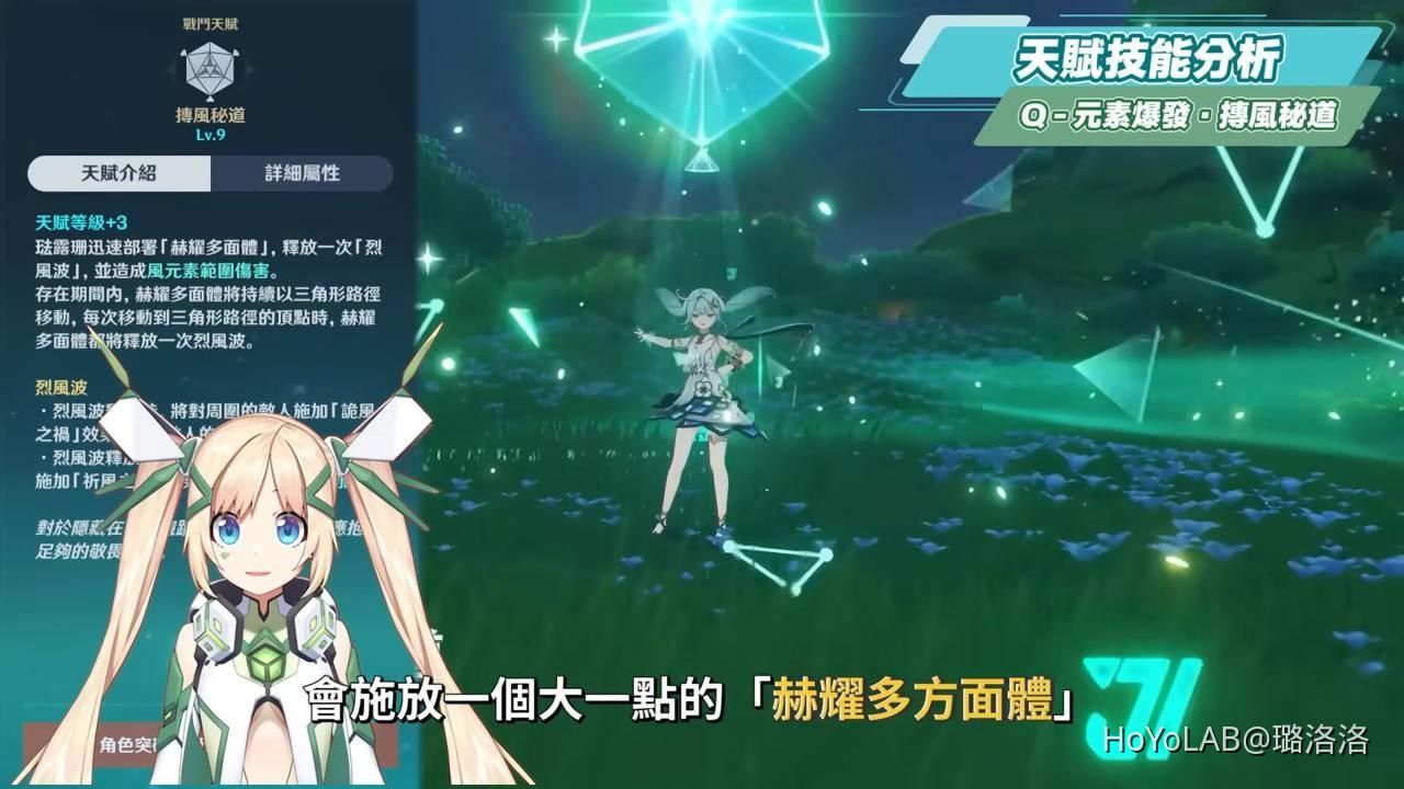 琺露珊的Q元素爆發是核心天賦,會施放一個大一點的「赫耀多方面體」,並會釋放一次烈風波,造成風元素範圍傷害,赫耀多方面體會以一個三角形的路徑移動,每經過2秒,在多方面體移動到三角形的端點時都會釋放一次烈風波,烈風波在釋放時會讓周圍的敵人降低風元素抗性,同時也會替所有的附近角色提升風元素傷害加成。雖然赫耀多方面體會移動看似有點捉摸不定,但多方面體釋放的烈風波範圍還算大,因此只要在三角型路徑周圍就可以輕鬆吃到BUFF,只是後續的烈風波就不會對敵人造成傷害,僅有提供BUFF和DEBUFF的效果,也因為烈風波每2秒一次刷新,因此若是有好幾波的敵人,只要赫耀多方面體還在場上,新出現的一波敵人也會被賦予減抗。