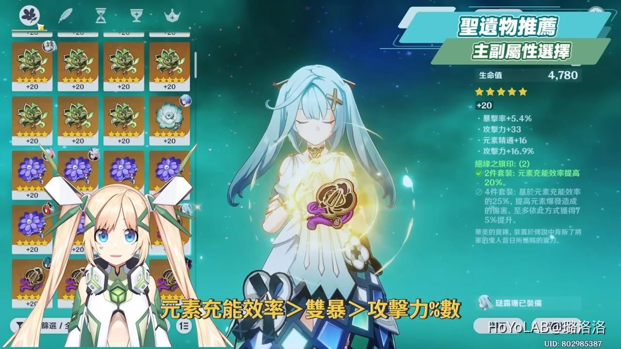 琺露珊的禮之冠可以選擇雙暴為主;空之杯選擇風元素傷害;時之砂選擇元素充能效率,副屬性可優先考慮:元素充能效率>雙暴>攻擊力%數。