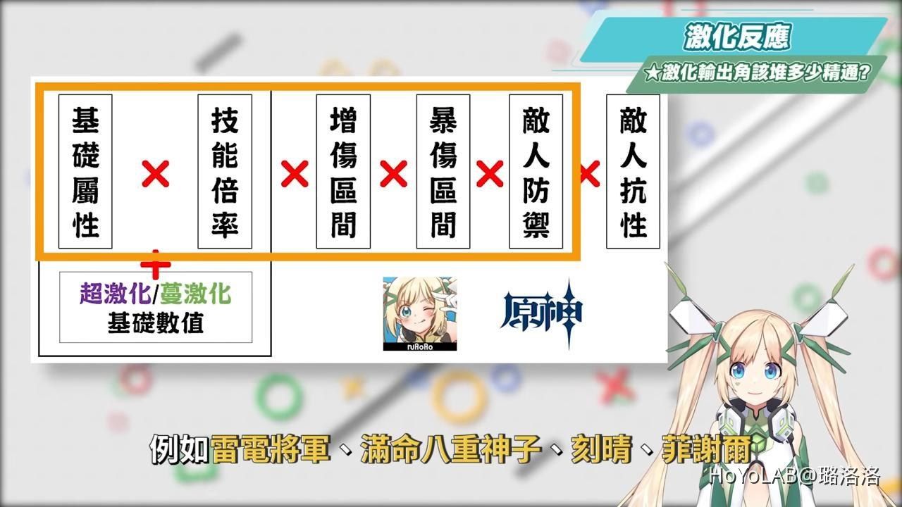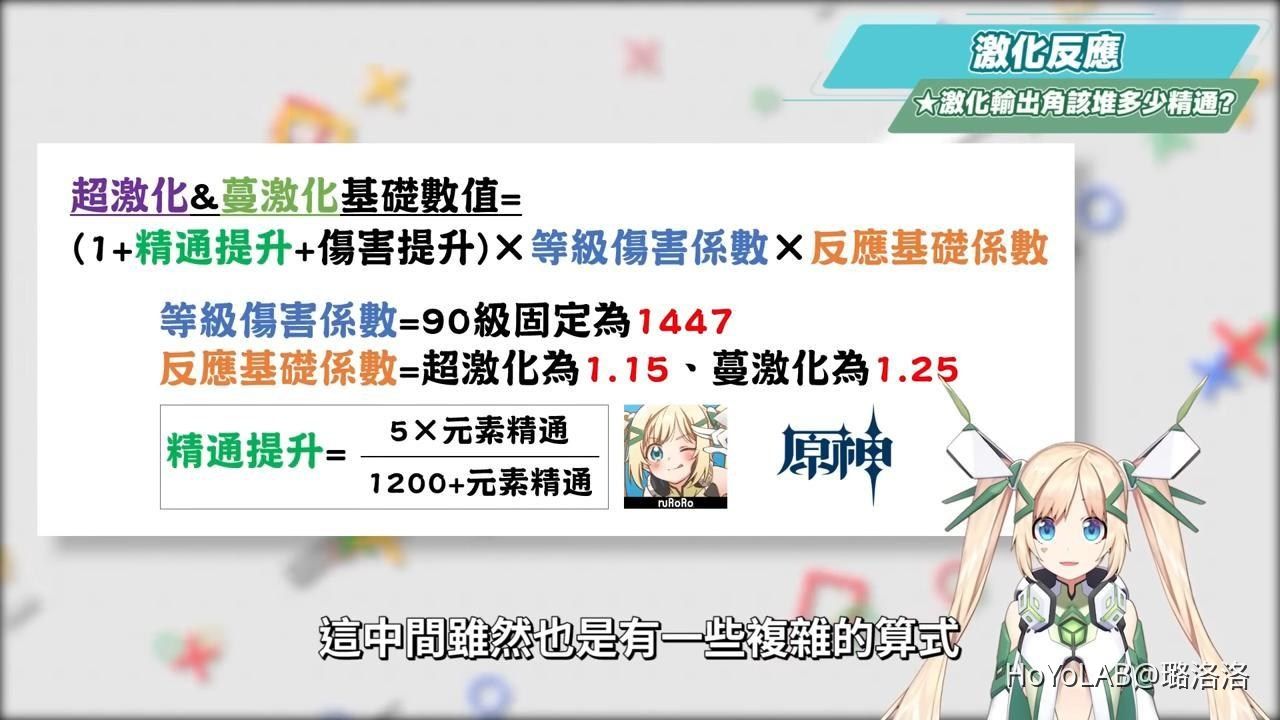484有人看到算式就暈了,解說這個算式並不是要大家去計算自己的角色傷害會有多少,而是我們要知道,在原激化狀態下的效果,會讓下次草雷附著傷害的基礎攻擊倍率增加,所以我們可以看到激化反應的傷害是可以吃得到暴擊率與暴擊傷害的加成,從這邊就可以知道激化反應是有別於劇變反應的計算,並且也和角色自身的等級、元素精通、增傷、敵人防禦與抗性係數有關,因此在培養激化隊的角色時,要特別拉抬上面提到的幾個重點項目。