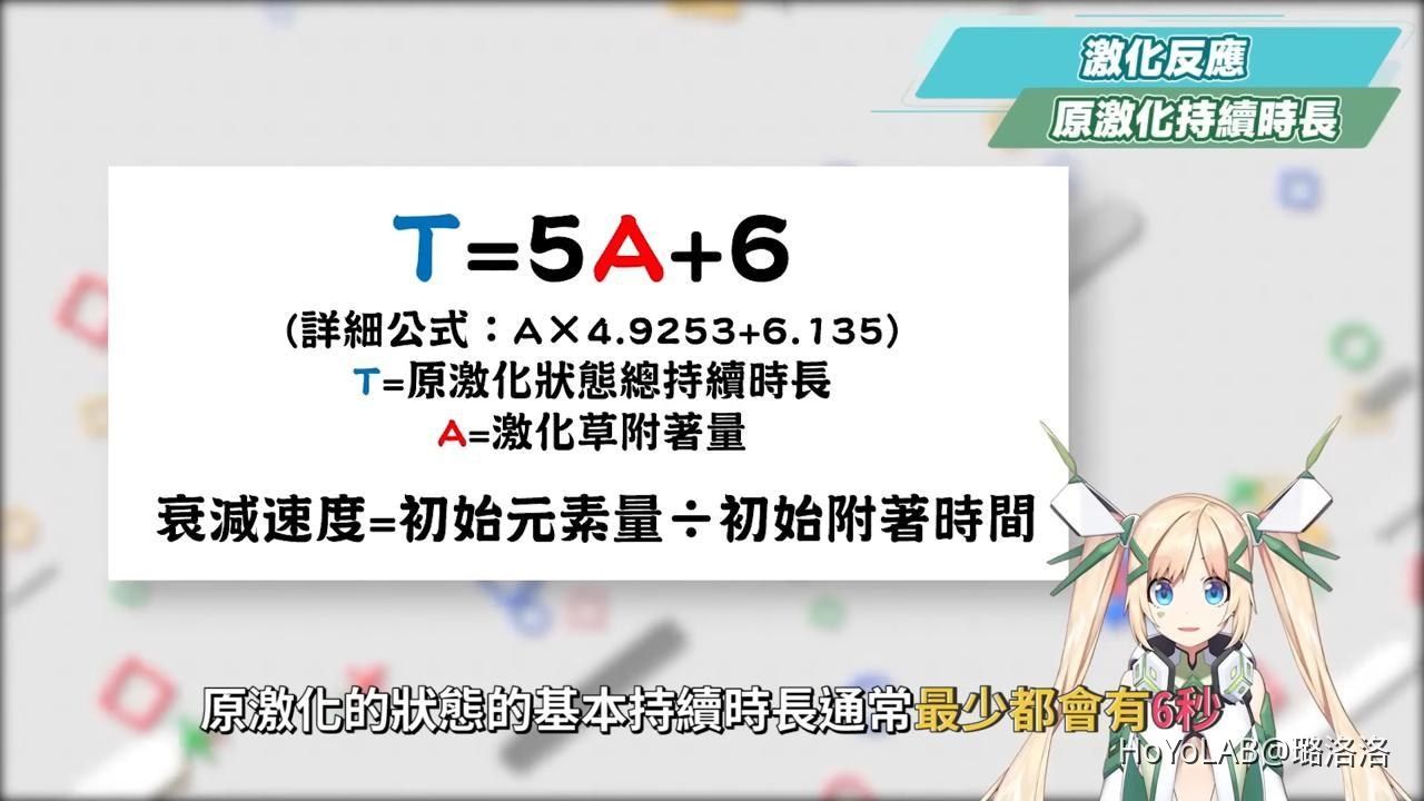 原激化的狀態的基本持續時長通常最少都會有6秒,大部分弱草和弱雷元素觸發的情況下都會落在10秒左右,若是透過強草和強雷則可以最長來到14秒左右,如果想了解持續時長和衰減速度的話可以參考下面公式: