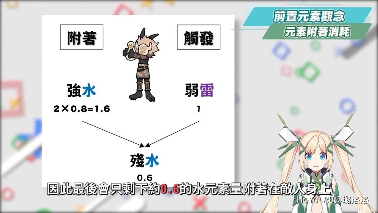 這邊再舉例,假如雷與水元素並無剋制關係,這時敵人身上有被附著強水元素=1.6元素量,而後手觸發元素為弱雷元素=1元素量,伴隨攻擊與反應完後會反應掉1元素量,因此最後會只剩下約0.6的水元素量附著在敵人身上。