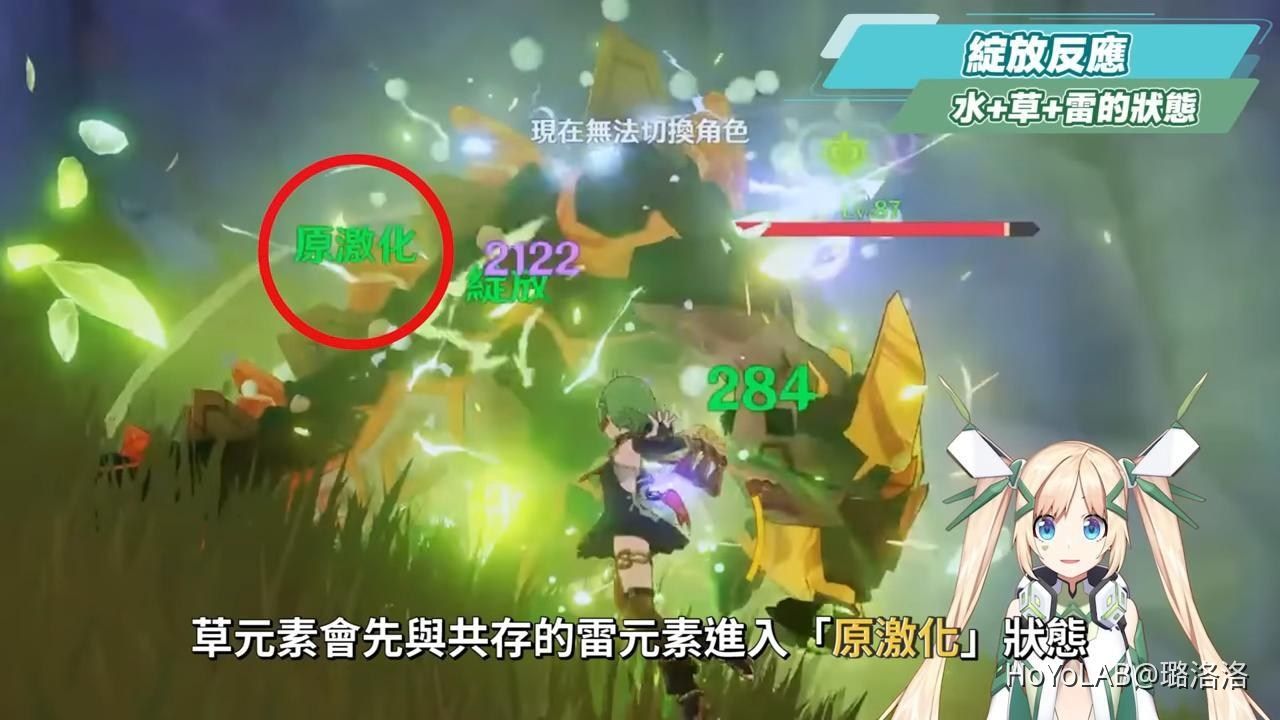這個草元素符號在陸服那邊的社群會稱其為「激元素」,但就洛洛的理解會認為,原激化並不是產生了一個額外的新元素,而就是對一種「狀態的解釋」而已,雖然草+雷反應後合而為一成為一個草元素符號,但這代表的是「被激化後的草元素」,並不是多了一個新元素,並且除了陸服以外的日本以及歐美地區,甚至是官方內容中也都沒有提到這是產生一種新的激元素的說法,所以為了避免萌新會誤以為原神除了七元素又多了第八種新元素,洛洛還是會傾向把原激化視為一種狀態,就像現實生活中的水會結成冰並不是它加了冰元素,而是受溫度影響改變了型態,變成了冰塊,洛洛也有看過社群有人說《原神》中水+冰元素會產生「凍元素」,但也是同前面所說,水+冰元素會產生「凍結」反應,但這個反應並不造成元素傷害,而是對於一種「狀態的解釋」,並沒有產生七大元素以外的新元素。但如果你已經習慣那樣的說法,你也可以選擇你比較容易理解的方式去融會貫通在你的遊戲裡面。