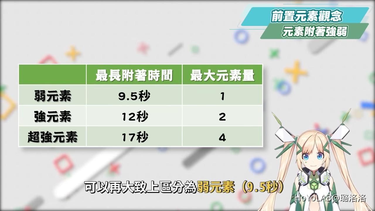 而元素附著按照最長時間附著的三種時長,可以再大致上區分為弱元素(9.5秒)、強元素(12秒)、超強元素(17秒),而也為了方便計算跟理解,我們可以再假設弱元素的能量為1、強元素的能量為2、超強元素的能量為4。