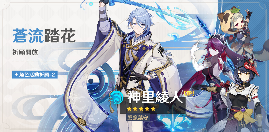 「蒼流踏花」祈願:「磐祭葉守·神里綾人(水)」機率UP!