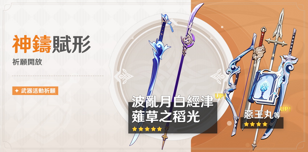 「神鑄賦形」祈願:「長柄武器·薙草之稻光」、「單手劍·波亂月白經津」機率UP!