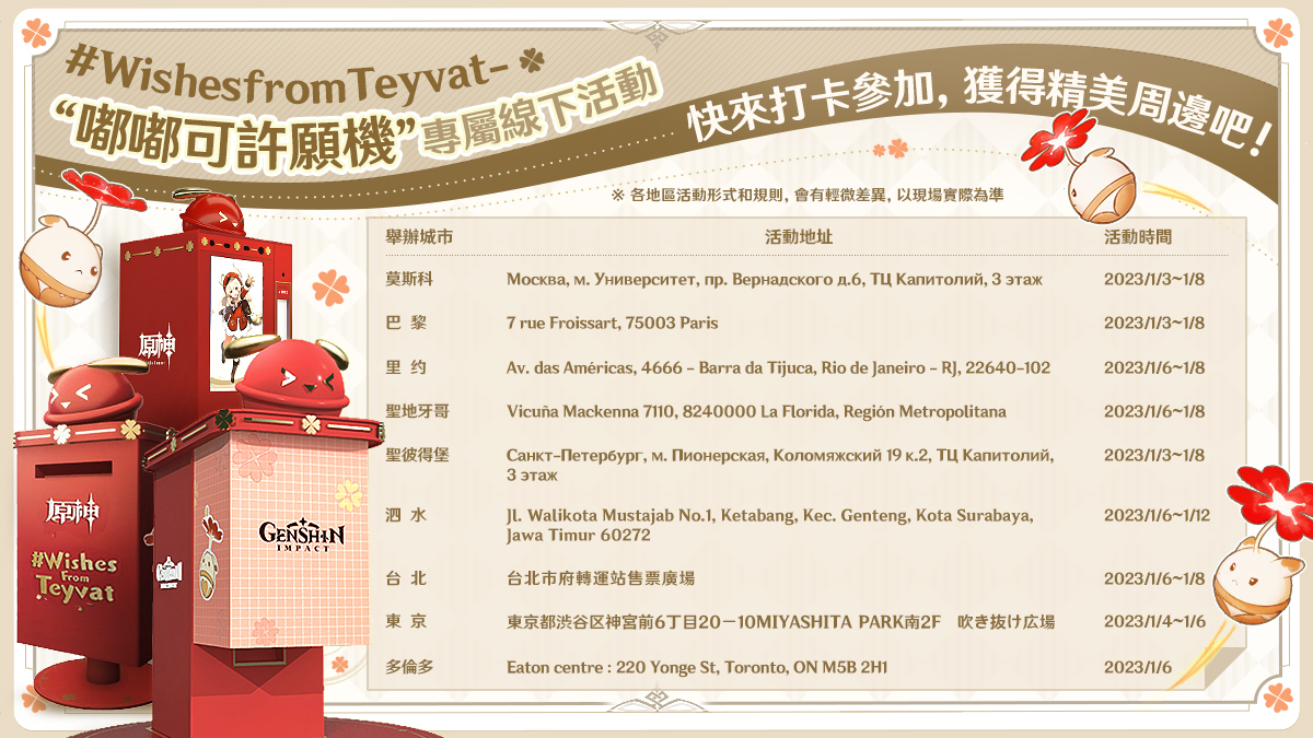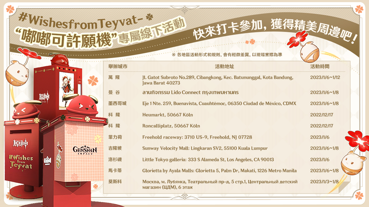 親愛的旅行者,#WishesfromTeyvat —— “嘟嘟可許願機”專屬線下活動將在以下地點開展,快來和派蒙一起打卡參加吧!