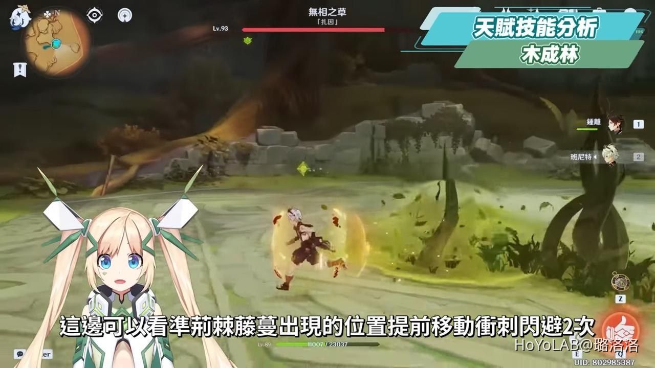 接下來是招式拆解的部分,木成林是無相之草會將外殼埋入地下,並從地下冒出荊棘藤蔓,追蹤角色所在的位置,荊棘藤蔓冒出後一段時間會有一小段AOE爆炸,這邊可以看準荊棘藤蔓出現的位置提前移動衝刺閃避2次,而此時BOSS也會露出核心,可以直接衝往核心攻擊,若此時有帶火元素角色可以直接將藤蔓燒毀。