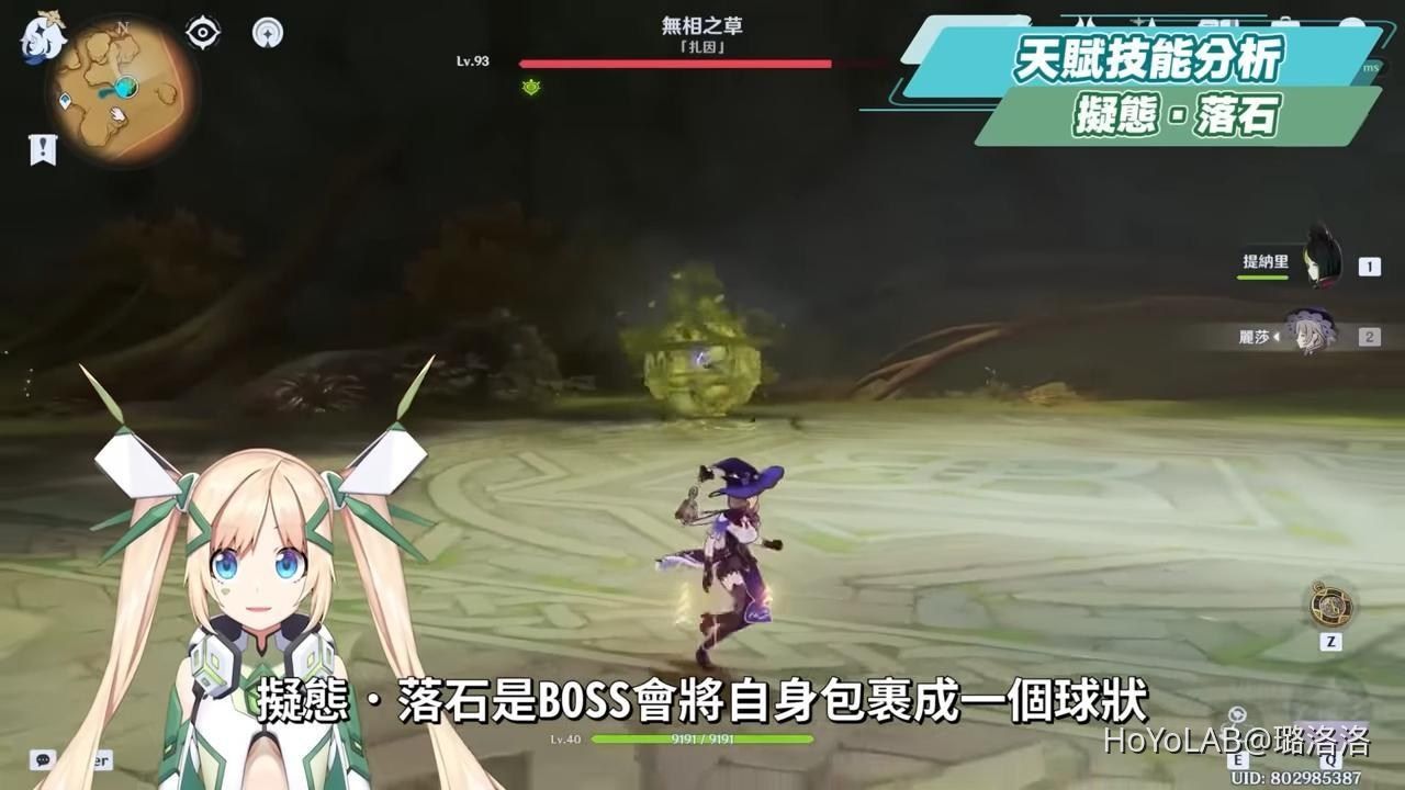 擬態.落石是BOSS會將自身包裹成一個球狀,並且彈跳到空中再往下砸,造成AOE傷害,BOSS往下砸時可以觀察地面會有一個光圈,一共會彈跳三次,第三次的傷害範圍較大,需要連續兩次的衝刺閃避才可以躲過,並且可以在第三次輸出完後再攻擊*露的核心,若此時有帶火元素角色可以直接將BOSS的外殼燒毀。