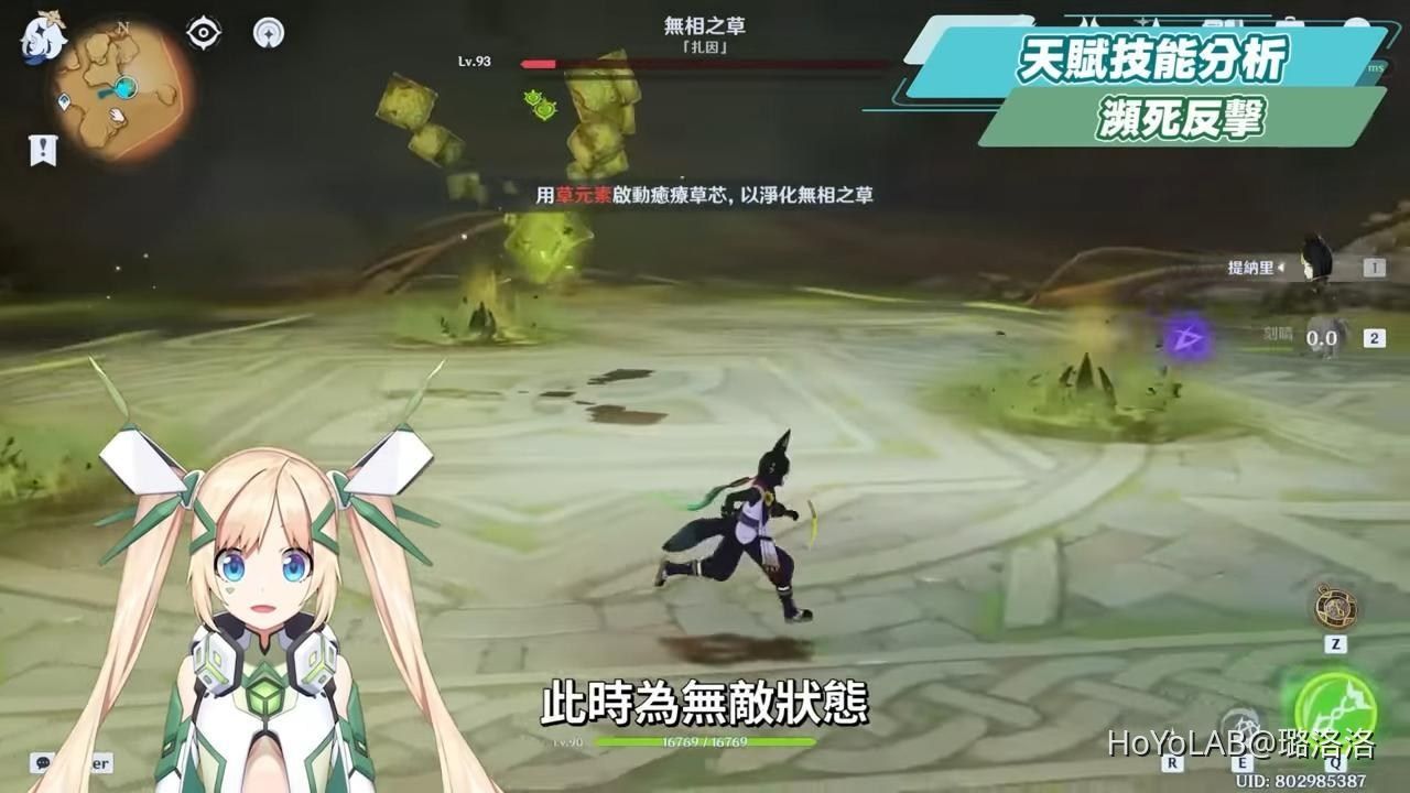當BOSS血量耗盡後就會使出瀕死反擊狀態,此時為無敵狀態,並且會在自身周圍生成三顆癒療草芯,這時就務必要使用草元素攻擊對三顆草芯進行淨化,淨化後的草芯會變成乾淨的綠色,過程中BOSS還會進行髒髒球攻擊要注意一下動向,這時若是再用雷元素對乾淨的草芯激化,會再變成像是被點亮的草芯,能夠加快淨化的速度,等到上方的淨化進度條滿之後,就會變成一朵獎勵花。