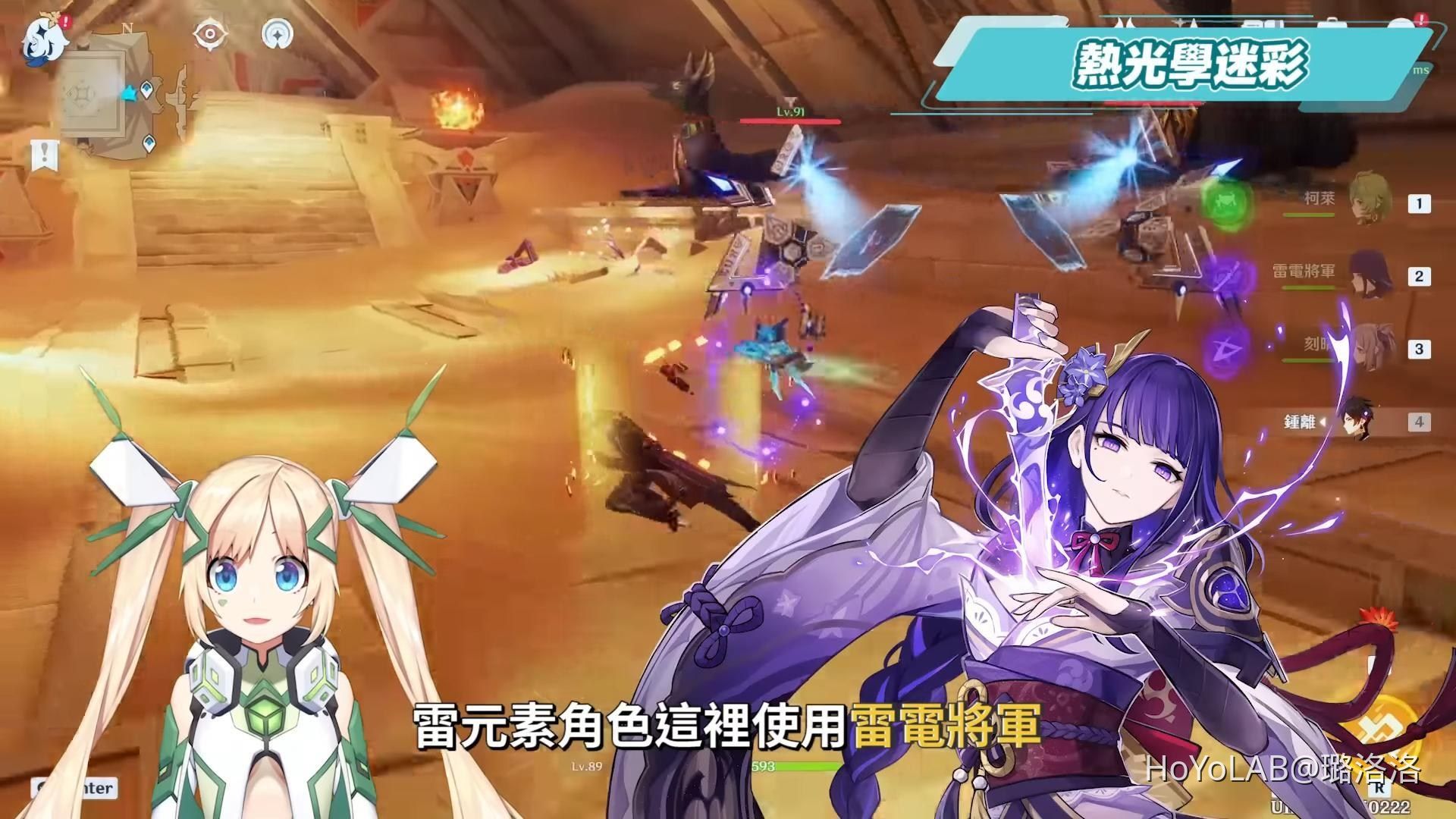 「熱光學迷彩」的達成條件是要在3秒內透過原激化、超激化、蔓激化反應或真識波,破除至少2台元能構裝體的不可視狀態,這邊推薦使用雷元素角色加上一名任意草元素角色,雷元素角色這裡使用雷電將軍,或是其它能有持續掛雷的雷元素角色,草元素角色則帶上柯萊,再來到赤王陵內部,或是其他一些沙漠遺跡中有至少2隻以上的元能構裝體所在處,找到怪物後使用雷元素技能使其上雷元素附著,接著切換柯萊使用E或Q技能觸發原激化反應後,就可以使元能構裝體顯形。