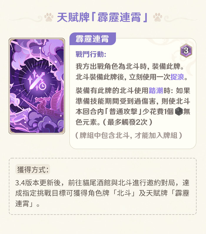 旅行者們好呀,3.4版本更新後,「七聖召喚」玩法將新增角色牌「可莉」、「北斗」及對應天賦牌。讓我們一起來瞭解一下吧~
