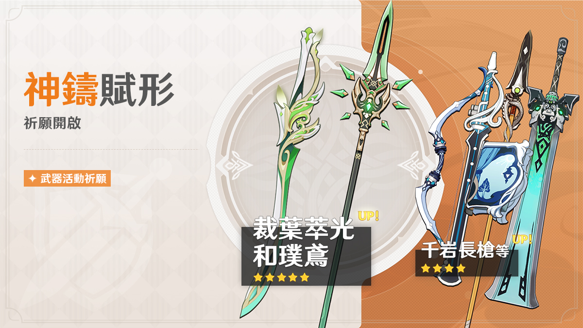 「神鑄賦形」祈願:「單手劍·裁葉萃光」、「長柄武器·和璞鳶」機率UP!