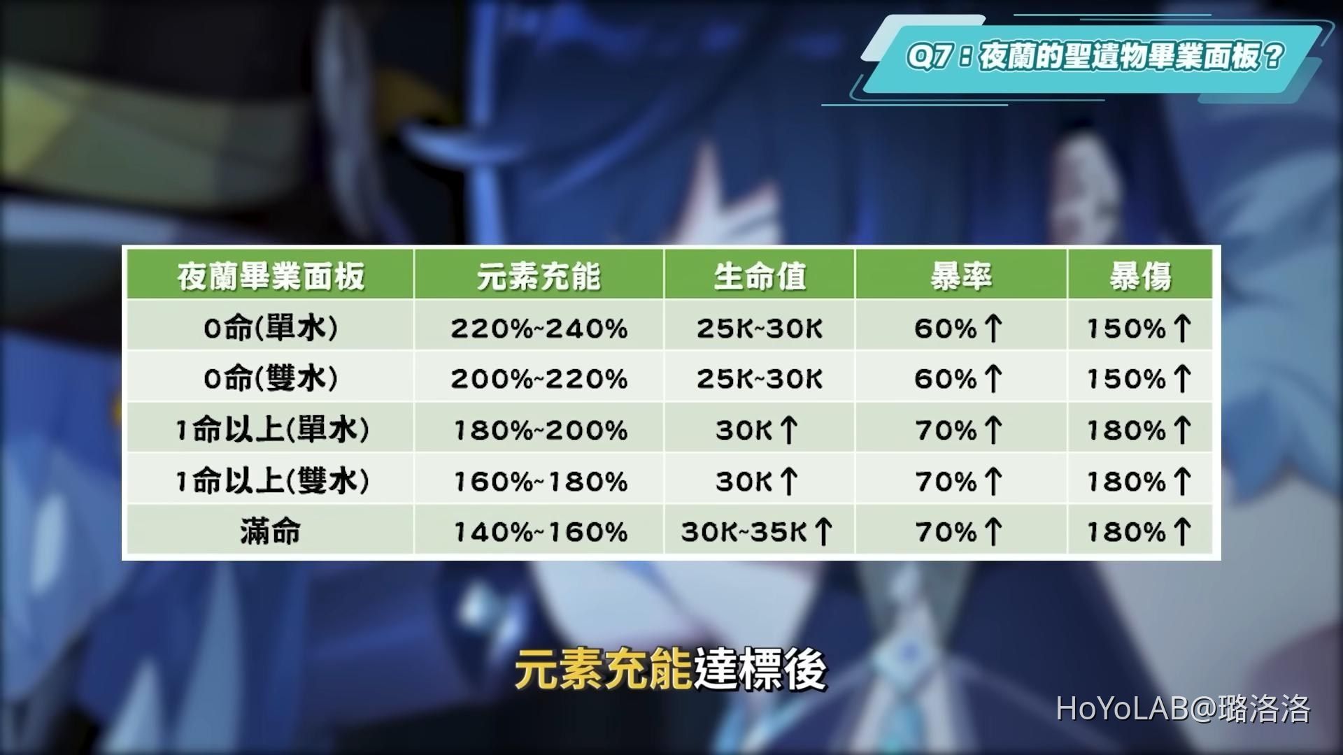 再來是聖遺物的畢業面板,主要分為未滿1命的夜蘭與1命以上的夜蘭,主要先看元素充能。元素充能達標後,再往生命值與雙暴的屬性堆疊,洛洛這邊稍微整理了一個相關的畢業面板表格提供給大家參考: