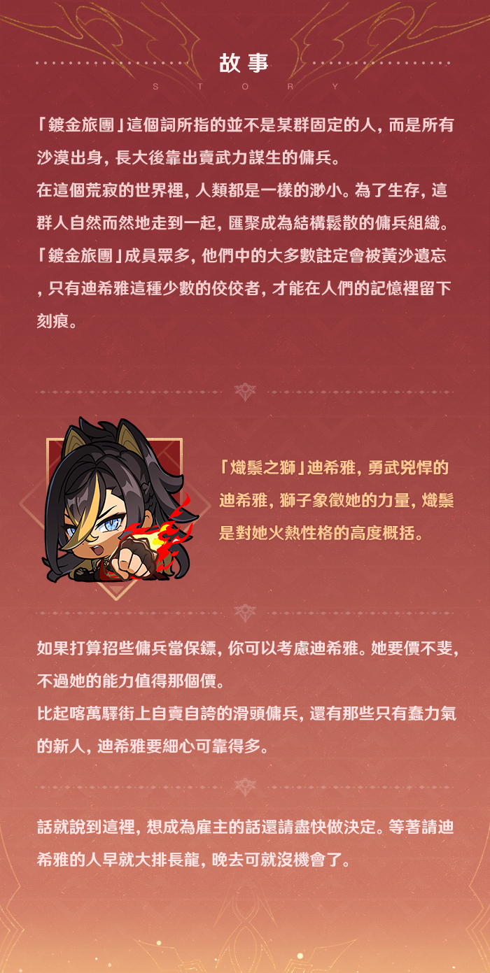 身為一名勇敢而又強大的戰士,她在「鍍金旅團」內部聲名赫赫。讓我們來瞭解更多關於迪希雅的故事吧~
