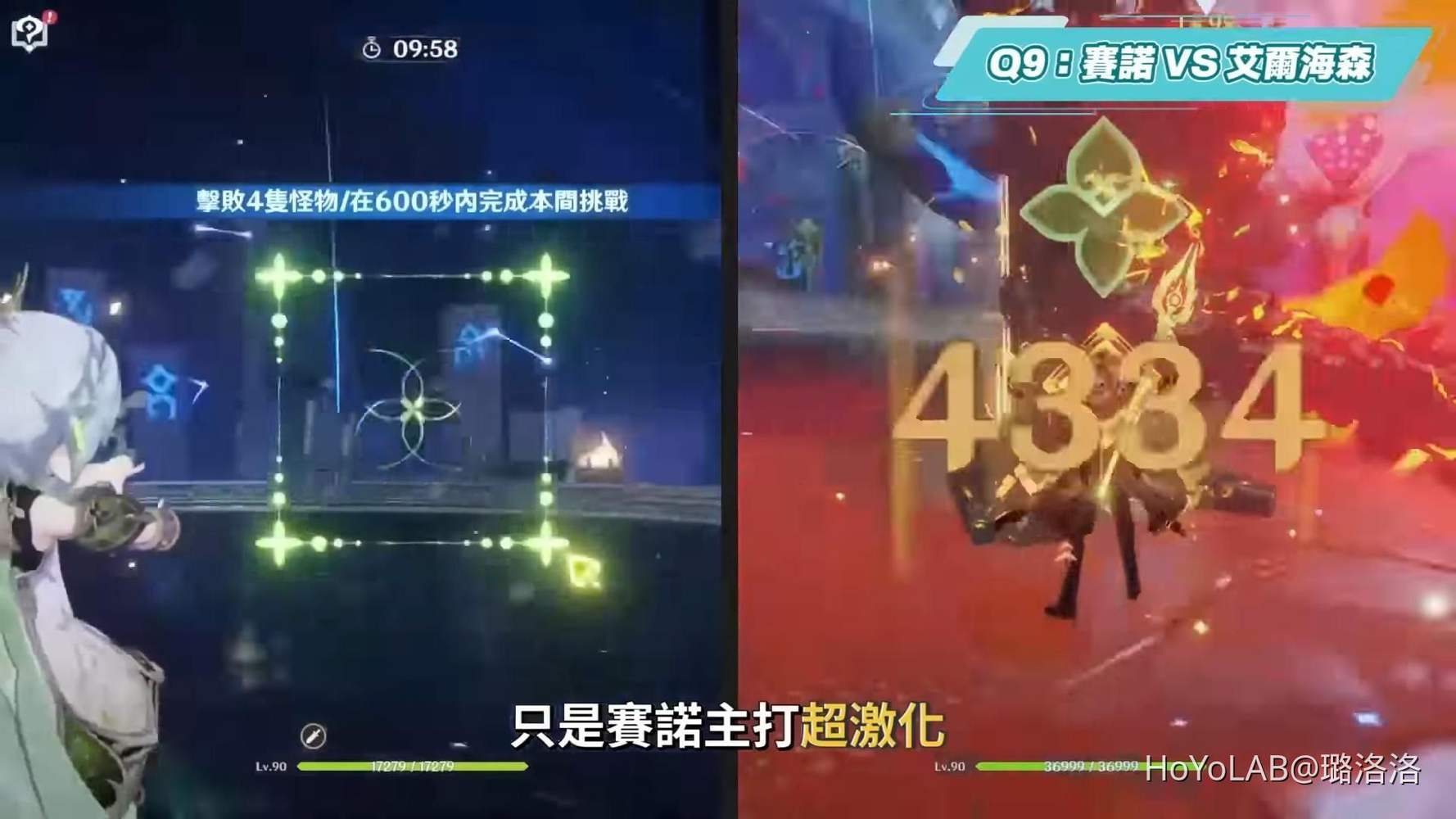 洛洛也有看到有人詢問賽諾和艾爾海森的差別,從強度來看的話兩名角色都具備五星角色的強度,只是賽諾主打超激化、艾爾海森主打蔓激化,因此洛洛主要也是從戰鬥體驗來分享這兩個角色的區別,賽諾在戰鬥方面,需要佔據長時間的站場,因此目前大部分的副C或輔助並沒有辦法支撐賽諾的長軸到他打完一輪,或是就要改成讓賽諾變成半軸的輸出方式,但另一方面就要注意大招能量是否來得及回復。而艾爾海森就比較可以透過速切的方式吃到其他隊友的BUFF加成,並且也可以搭配E技能站場輸出,但賽諾全部都需要透過Q大招來輸出,因此輸出模式上會比較單一一些,兩個角色在同樣配置「納行久」的超激綻隊員的情況下,洛洛會覺得艾爾海森的超綻放隊伍玩起來更順暢,而賽諾的話就是會覺得有些BUFF,在賽諾大招打到後面時,BUFF都沒了,會感到有點彆扭,解決這個彆扭感還是需要讓賽諾改為半軸輸出。