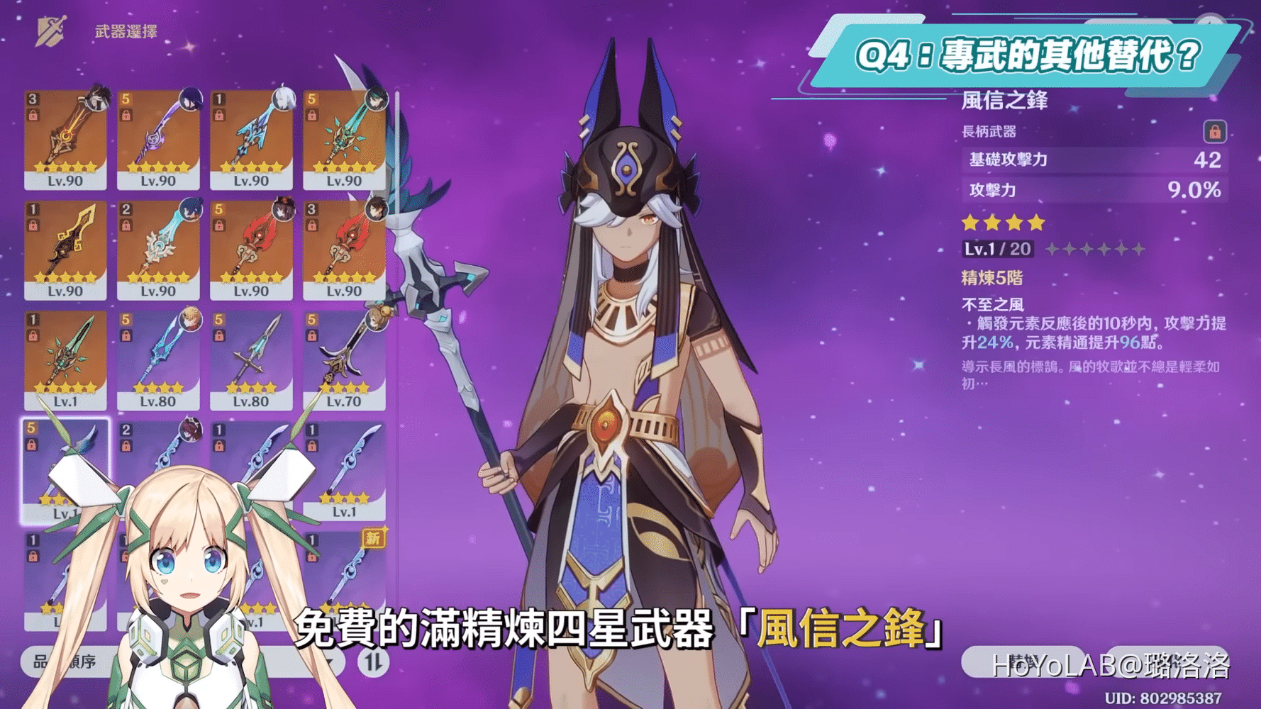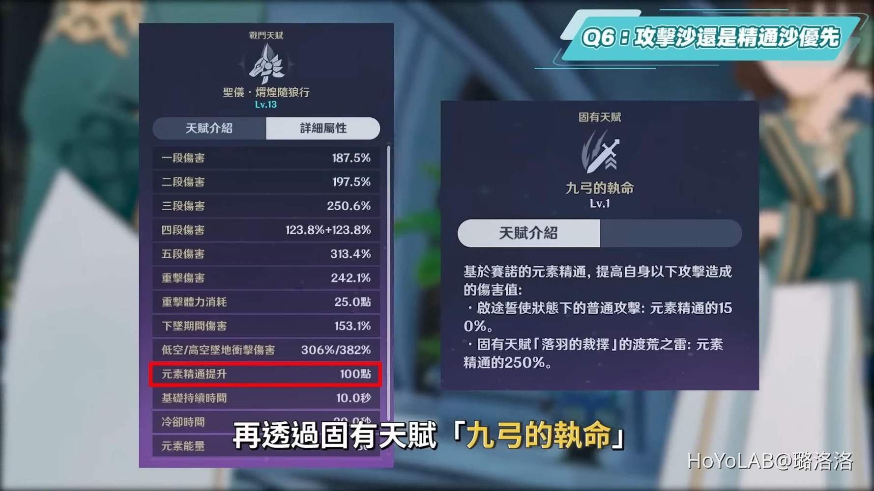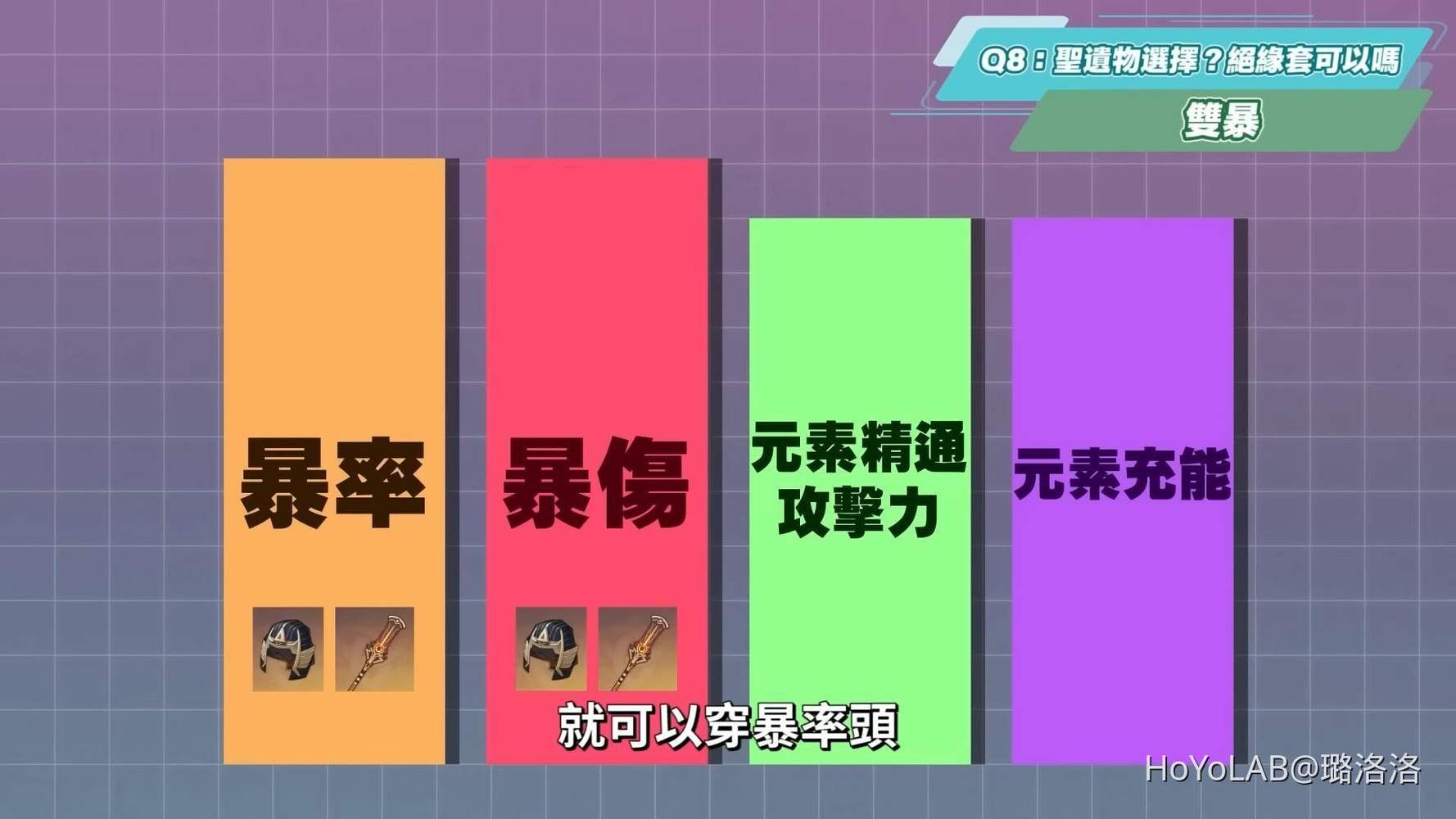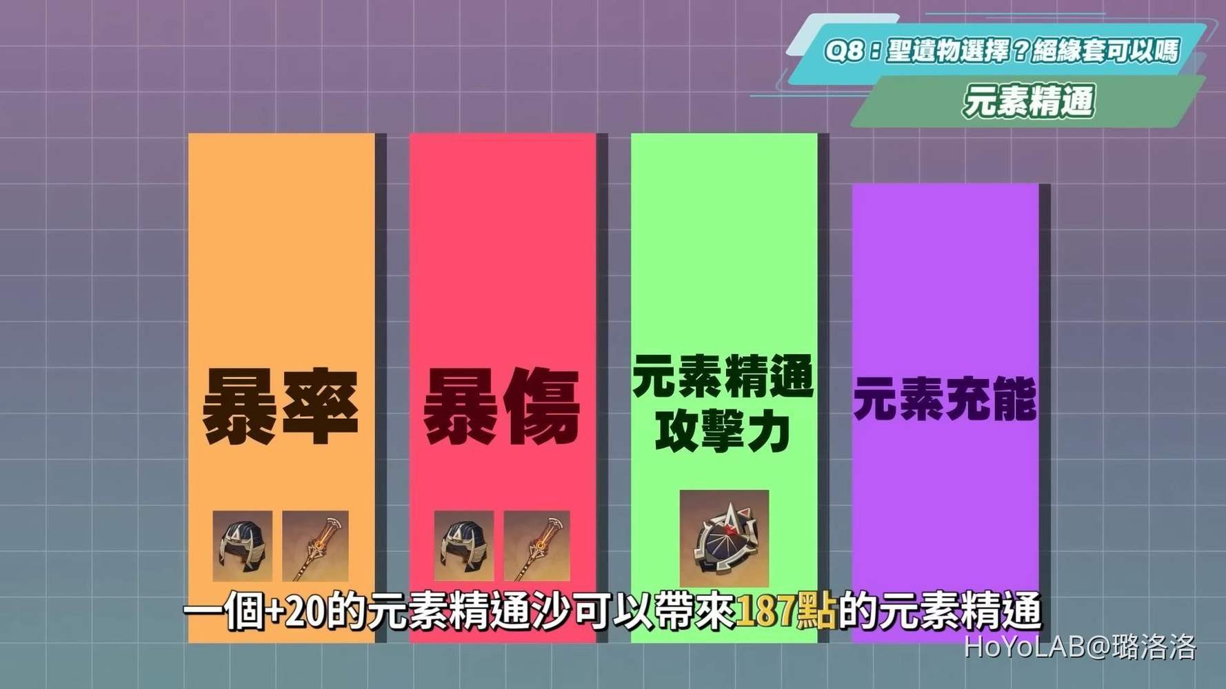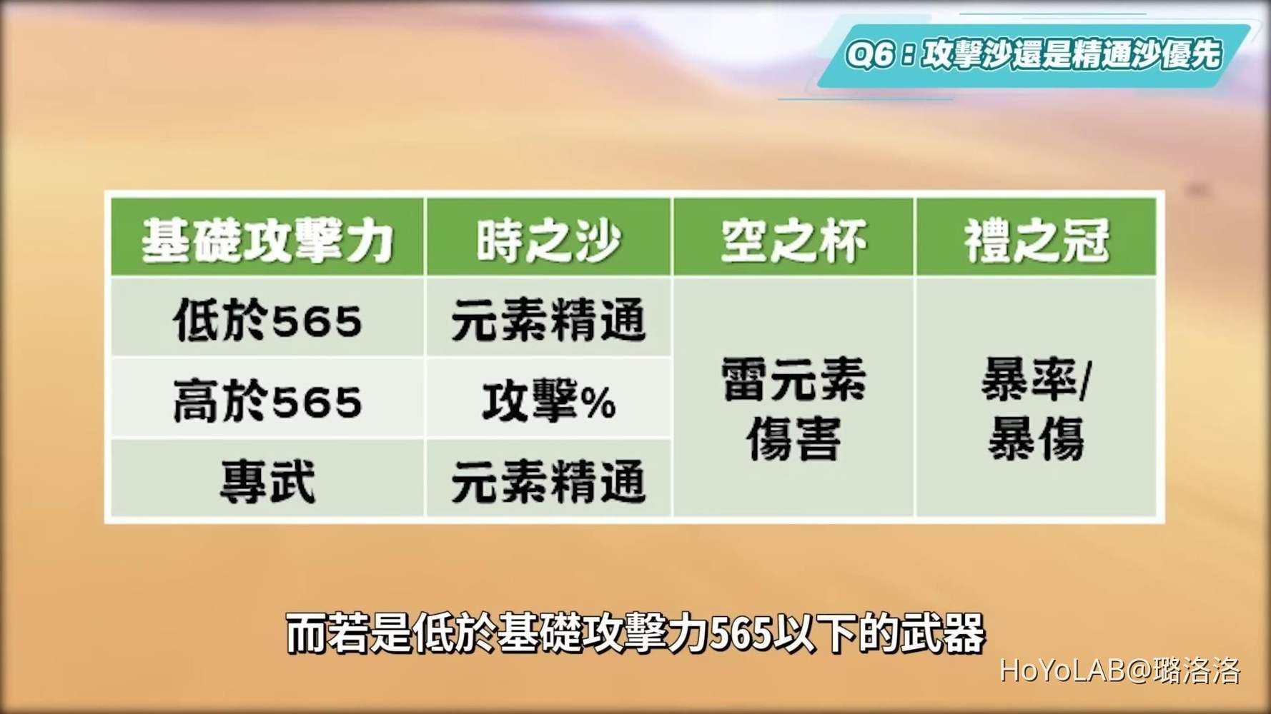 這邊洛洛就直接就說結論的懶人包,假如你是專武赤沙之杖,那麼就是元素精通越高越好,因此毫無疑問選擇元素精通時之沙。若是非專武的五星**最推薦的會是和璞鳶,其他非五星武器則會最推薦白纓槍,不只加暴率,高精煉帶來的普攻加成效果也很不*,*風信之鋒要來得更好。但如果是基礎攻擊力高於565以上的武器,像是護摩之杖、和璞鳶、息災這種,因為武器自身帶有的攻擊力高,因此直接搭配攻擊沙來轉化更多攻擊力才是效益更好的選擇,聖遺物若有元素精通的副屬性也可以加減堆疊一些,而若是低於基礎攻擊力565以下的武器,像是決鬥之槍、白纓槍,這種低攻擊力的數值就算用攻擊沙也轉化不了多少攻擊力,因此除了穿元素精通的時之沙之外,最好也在聖遺物副屬性盡量多堆疊元素精通,盡可能堆到320~440左右的元素通,這樣搭配開大後的元素精通提升才能有足夠的傷害,但洛洛認為拿低白值的武器要堆到這樣的元素精通其實蠻困難的,所以只要通常是配戴一個+187點的元素精通沙後,其他靠副詞條看運氣來堆,不需要硬湊元素精通而改掉其他空之杯和禮之冠的主屬性,記得拿低白值的武器和專武就穿元素精通沙、高白值武器穿攻擊沙,剩下就是看是否有能力抽出專武來給賽諾更多的提升。