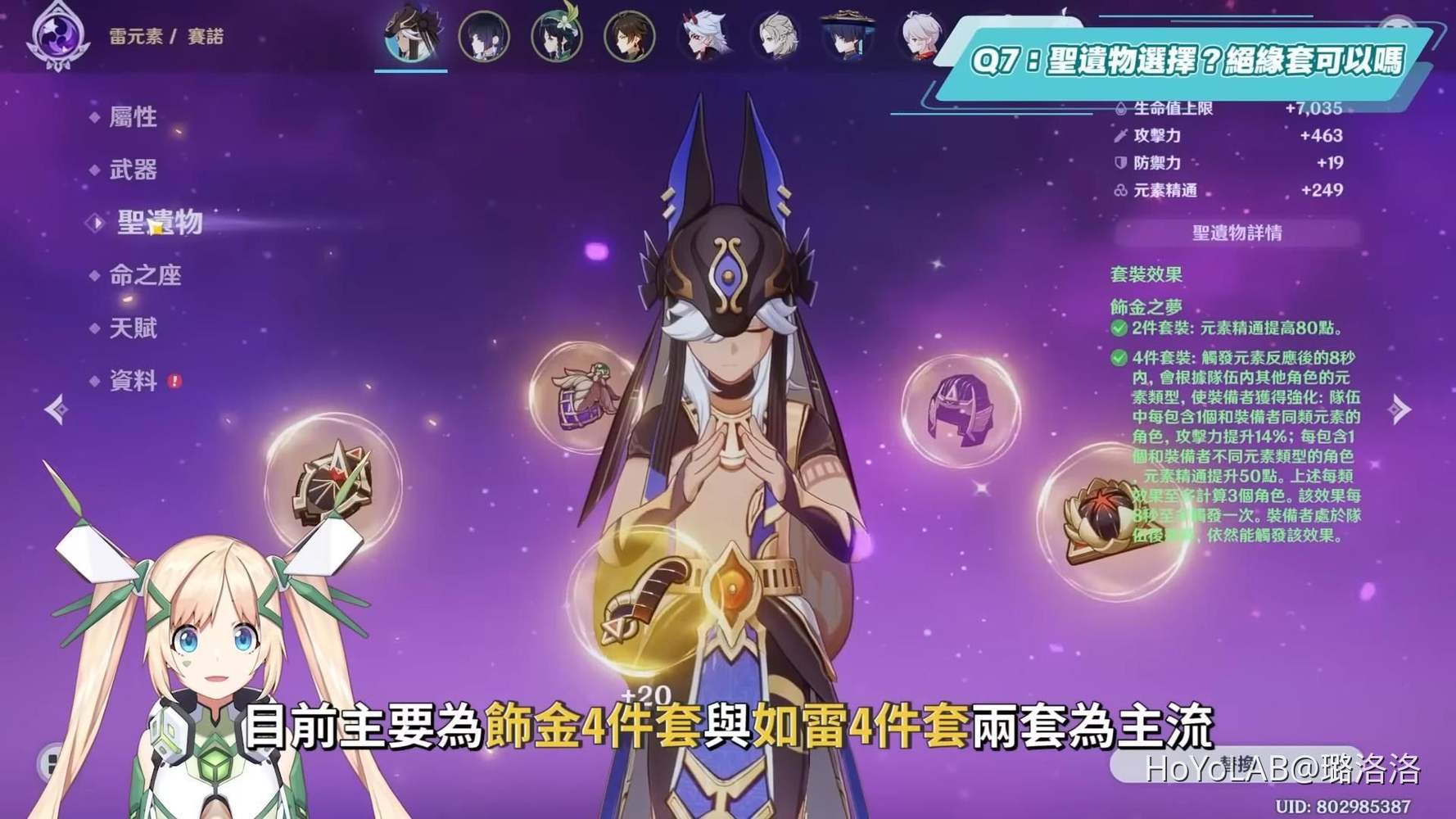 賽諾的聖遺物選擇,目前主要為飾金4件套與如雷4件套兩套為主流,飾金套可以提升賽諾的輸出傷害,如雷套是可以更頻繁得打出E技能,但是在QTE上比較容易亂節奏,因此可以依照自己個人喜好去穿戴,但洛洛自己是比較推薦飾金4件套,因為在搭配專武以及隊友觸發4件套效果時,總體傷害可以提升得比如雷套要來得多,但其實兩套的傷害量也沒有差距多少,因此哪一套的詞條比較好就可以優先穿那一套。再來有些新手也有詢問洛洛為什麼不能穿絕緣4件套,主要就是在於4件套的效果並沒有辦法讓賽諾大招吃到加成,因為賽諾開Q後的攻擊模式為普攻模組,但如果在傷害足夠、缺少充能的情況下,也可以稍微犧牲一些傷害,轉而搭配2件套的絕緣提升充能,另外2件套可以選擇攻擊%、元素精通、雷元素傷害相關的聖遺物2件套,命座和武器、時之沙所帶來的面板總數值也需要整體來看,才知道自己的賽諾面板要怎麼堆,這一塊也可以參考後面洛洛的5大數值拉抬的Q&A說明。