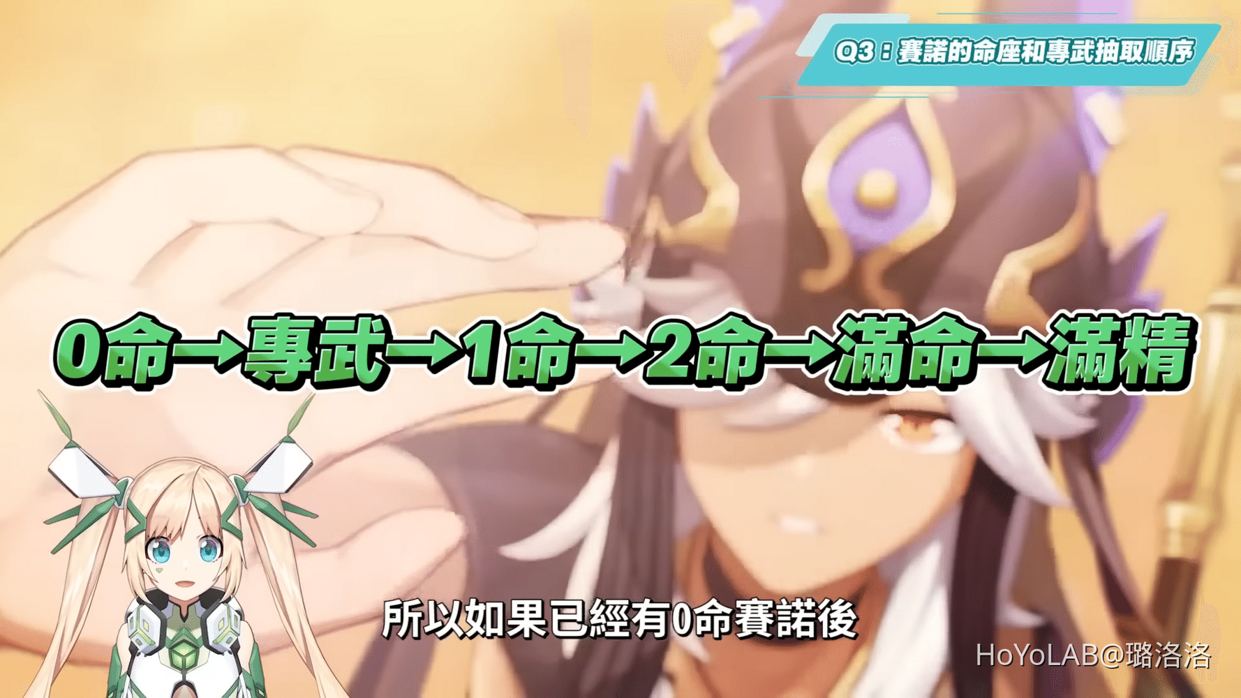 在3.5版本的上半卡池中,會迎來賽諾這名角色的復刻,而下半卡池也會復刻神里綾華這名強力主C,或許有些肉肉們在猶豫賽諾和綾華怎麼選?以及不清楚賽諾命座與專武抽取順序應該是怎麼樣的,因此還不知道該怎麼抽的話,也可以參考洛洛接下來的建議,同時也會補充在草神登場後的賽諾主流隊伍配置,也因為這期影片不會從太多基礎的角度去解說賽諾的技能特性,如果不了解賽諾這名角色,也可以先點擊右上方資訊卡查看先前製作過的賽諾培養全分析,看過後再來觀看這期的影片,影片中洛洛也彙整了在Instagram限時動態上一些常見的Q&A,幫助你更好的了解賽諾這名角色哦!