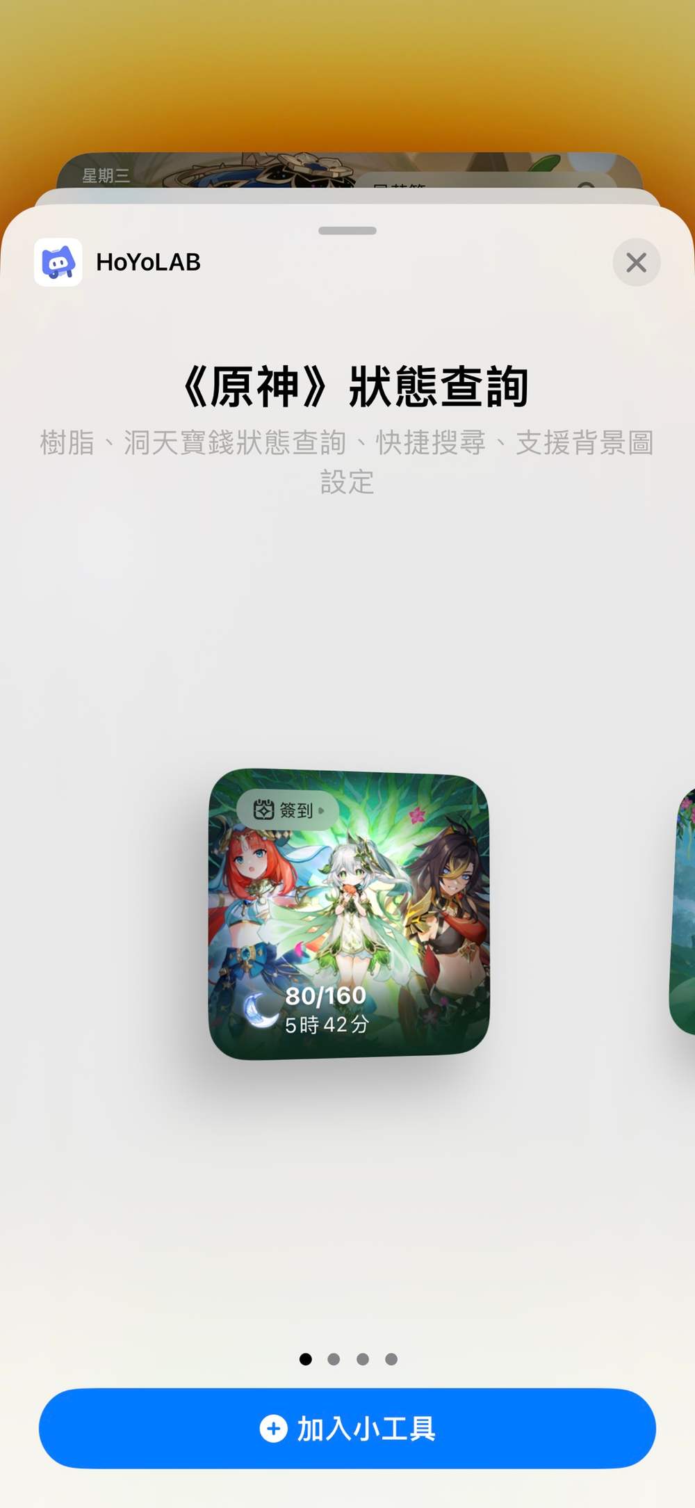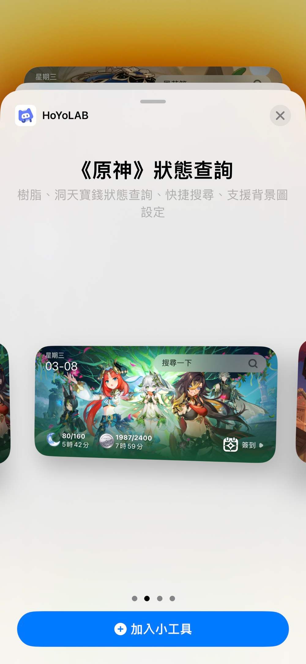 (2)搜尋「HoYoLAB」並點擊新增《原神》小工具