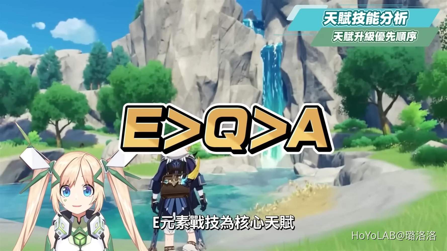 天賦升級優先順序方面,E元素戰技為核心天賦,每升一級都可以提升攻速,其次Q元素爆發,A普攻可升可不升。