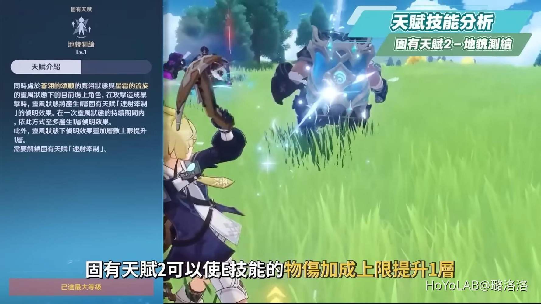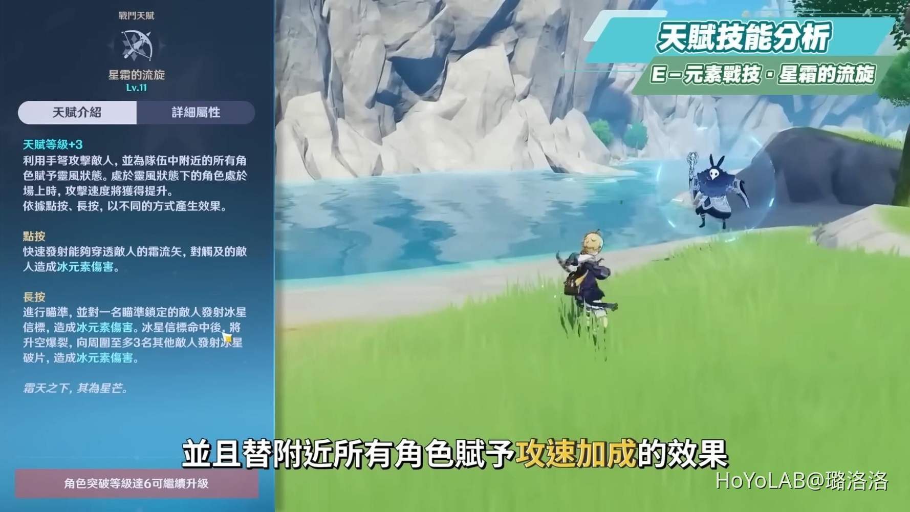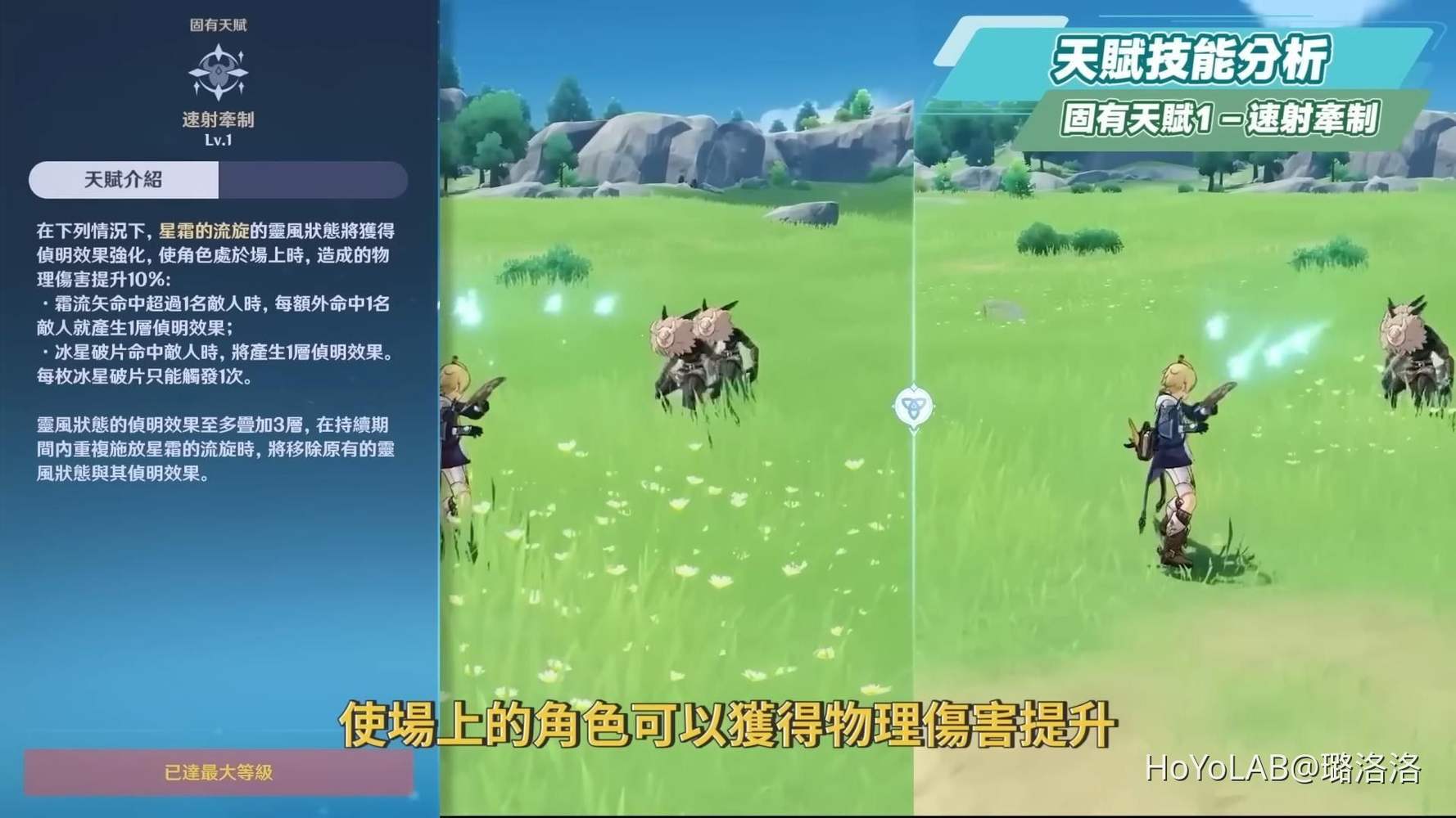 固有天賦1主要是可以透過點按或長按E時使場上的角色可以獲得物理傷害提升,持續時間12秒、冷卻時間15秒,最多可以獲得3層的物理傷害加成,每層10%,最多30%,如果是點按E命中敵人,命中的該名敵人不算,額外命中的敵人可以產生1層物理加傷,而若是長按E,當冰星破片命中最多3名敵人時,就可以獲得3層加傷,但也就表示場上需要有4名敵人,才能在長按時觸發到最多層數,相對的,因為命中的第一個敵人不算層數,所以如果是對到單體敵人時,像是魔偶劍鬼這種,就比較難疊加層數,所以大部分實戰情況下,對群可以用長按,若對單則可以用點按。
