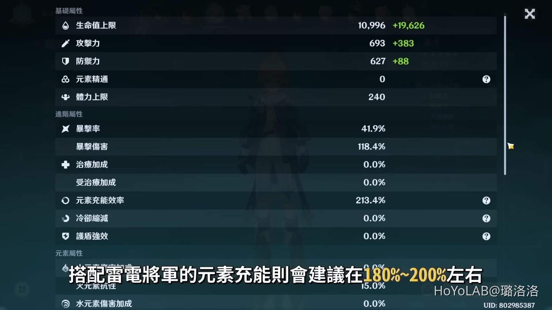 畢業面板參考,血量可以在30000以上,元素充能效率若是沒有搭配雷電將軍的元素充能則會建議在180%~200%左右,隊伍中有雷電將軍則大致上可以改成生命沙,元素充能有120%~130%左右就夠用了,若是搭配西風**則暴擊率需要疊到至少50%以上。
