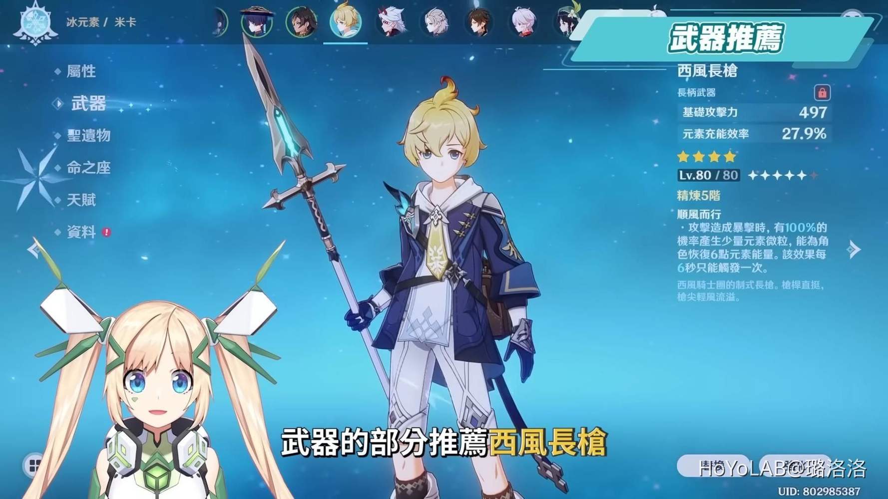 武器的部分推薦西風**,或是其他元素充能或生命值相關的**武器,像是天空之脊、薙草之稻光、漁獲、試作星鐮、喜多院十文字、護摩之杖、黑纓槍等等都可以。