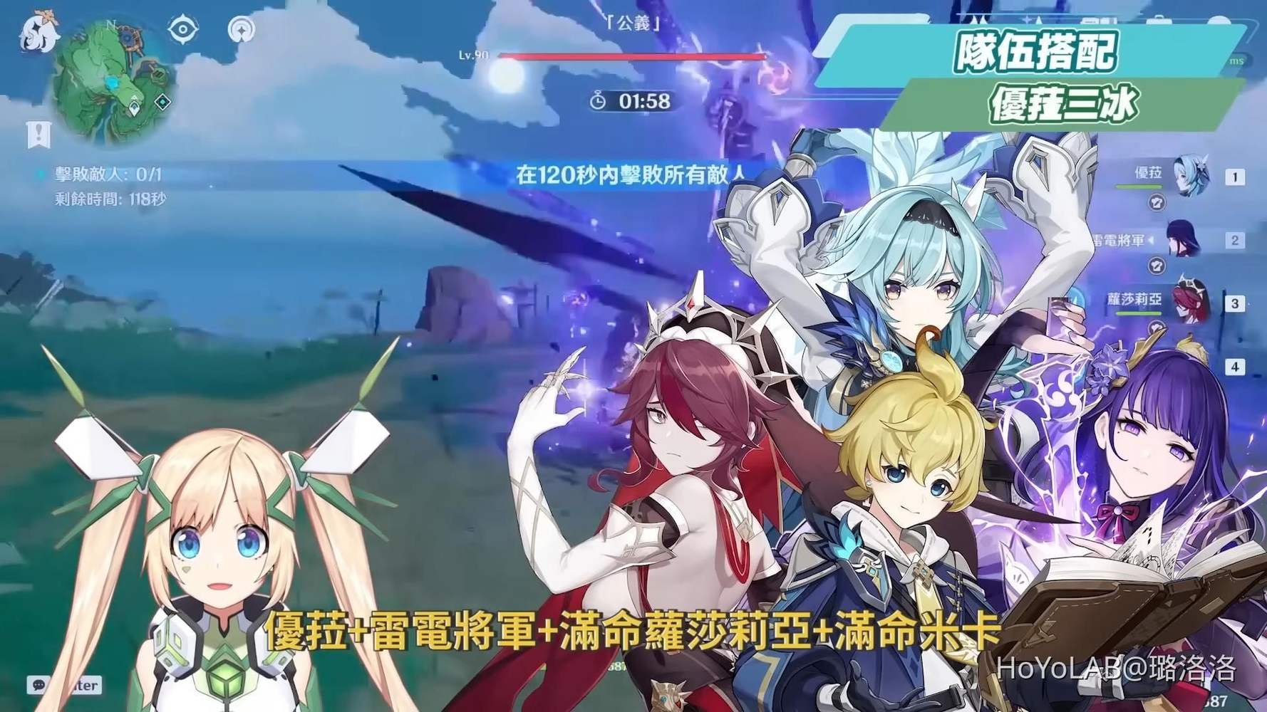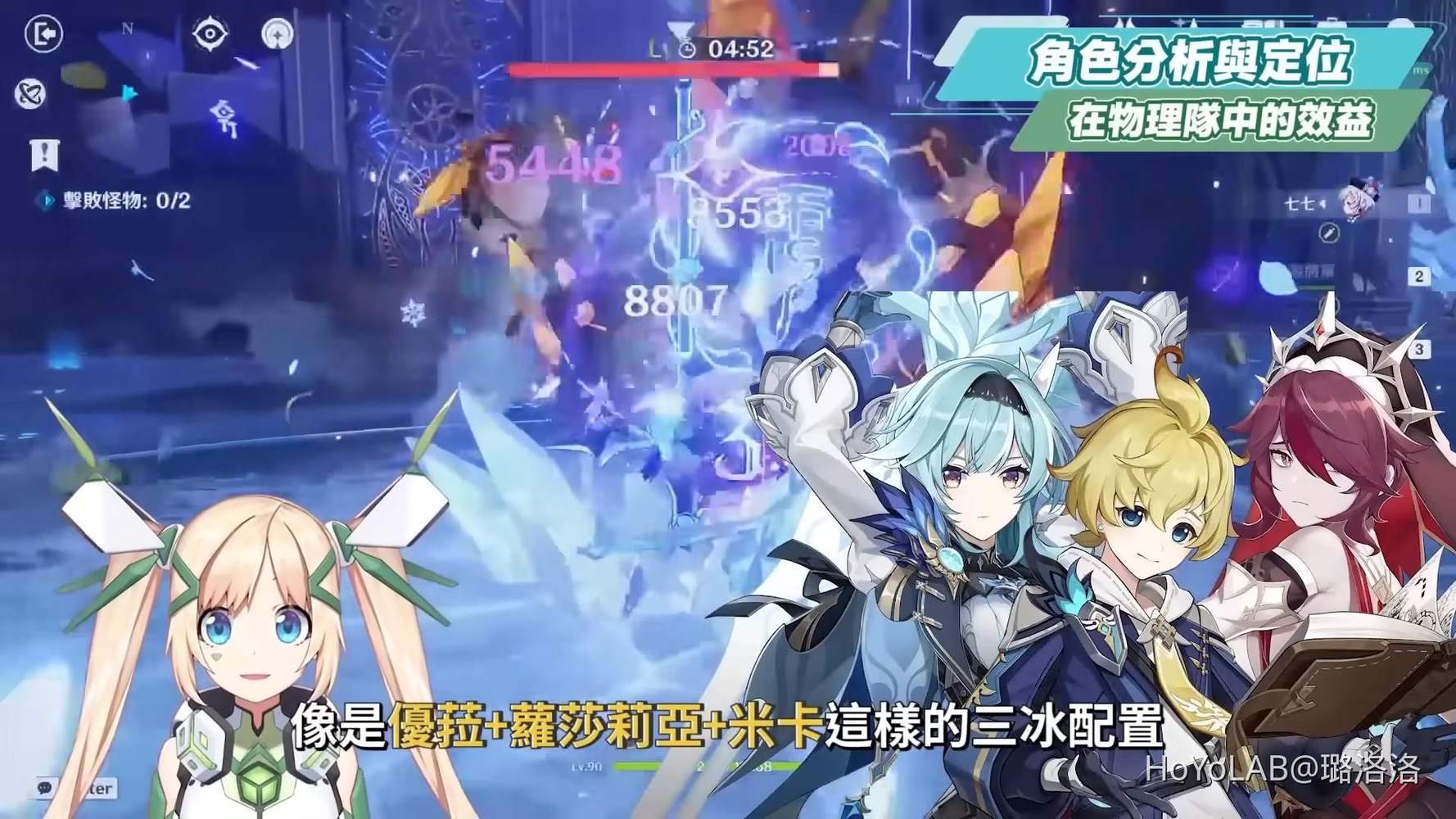 優菈三冰的隊伍陣容為優菈+雷電將軍+滿命蘿莎莉亞+滿命米卡,輸出的手法為雷神E上雷→米卡QE→蘿莎莉亞QE→優菈EQ開大跳舞,要注意滿命米卡的物理暴傷加成需要在E技能的靈風狀態12秒內,快速銜接滿命蘿莎莉亞的10秒物理減抗,最後優菈開大後不能速切角色引爆光劍,才能盡可能吃好吃滿所有的BUFF。