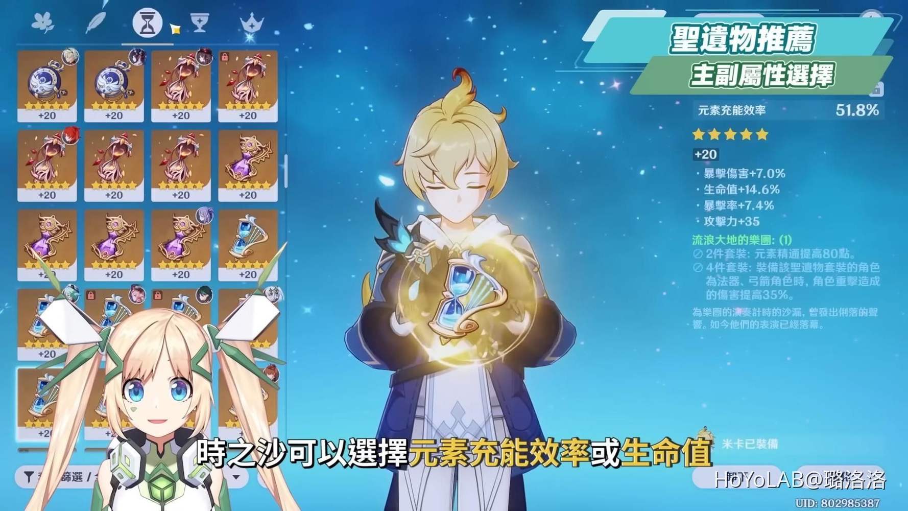 聖遺物主副屬性選擇,時之沙可以選擇元素充能效率或生命值,若對於大招比較重視可以優先穿元素充能效率,空之杯選擇生命值、禮之冠選擇生命值或是治療加成。
