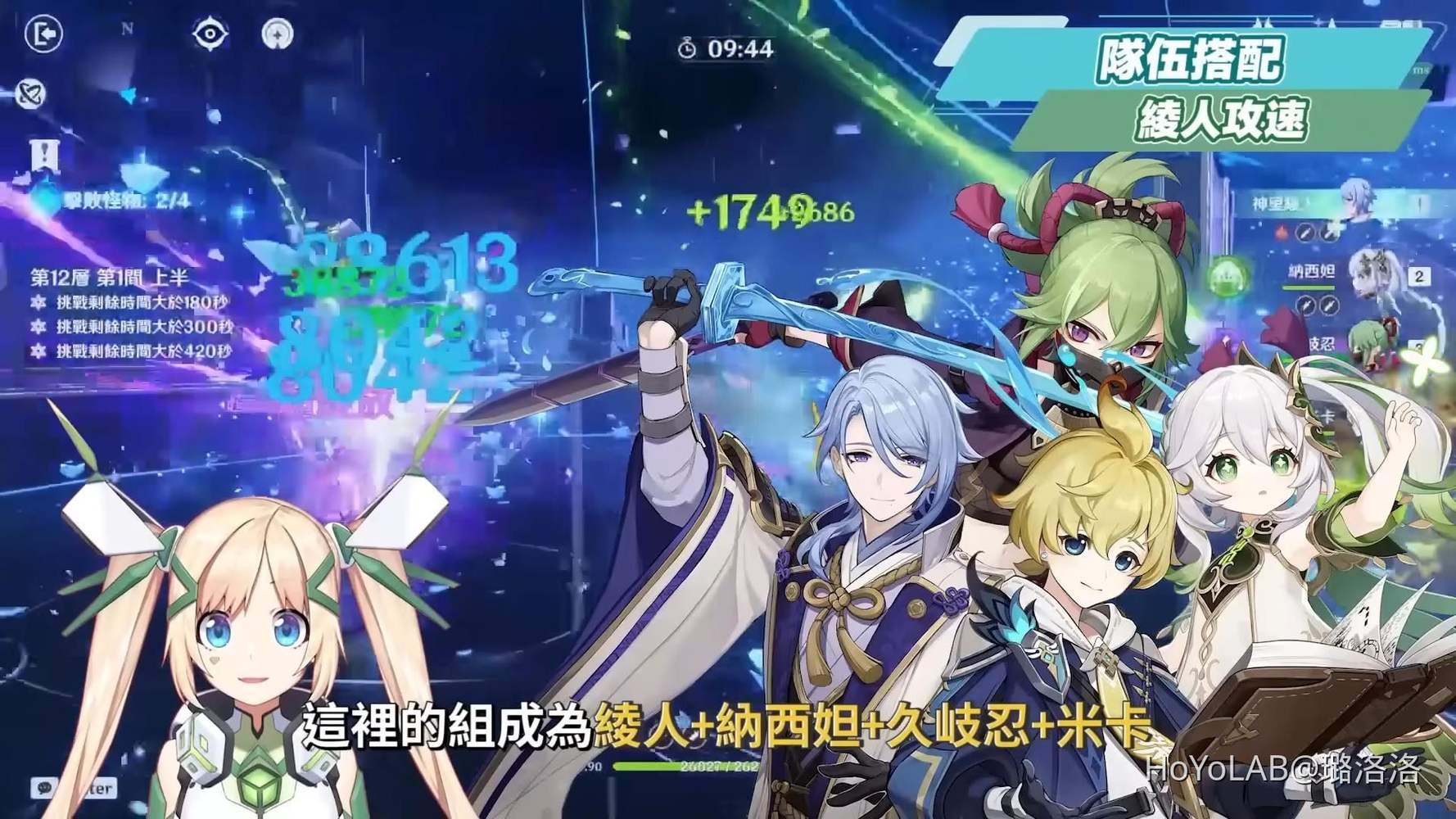 另外一名也以普攻為主要輸出形式的綾人,洛洛自己試用起來搭配米卡的陣容也還不錯,並且也可以再搭配草元素相關的體系做一個變化,這裡的組成為綾人+納西妲+久岐忍+米卡,綾人原本自身需要靠提升到4命才有15%的攻速加成,但現在只要有一個0命米卡就可以吃到攻速加成,搭配草神和精通流的久岐忍也可以打出凍結+超綻放的效果。