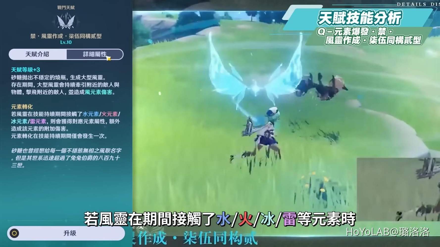 Q大招施放後會釋放一個類似蝴蝶的大型風靈,並且揮動翅膀持續產生牽引和擊飛的效果,這個聚怪的力度比起E技能稍微再強一點,就是可以把女孩子吹倒的程度,但又不至於把女孩子吹到天上的感覺,實戰中這個聚怪效果就是不上不下的程度。需要更注意的還是在於元素染色的部分,若風靈在期間接觸了水/火/冰/雷等元素時,就會轉化為該元素,並且額外造成該元素的附加傷害,染色優先順序要注意是火>*>*>冰,假如場上同時有火元素和水元素,這時風靈就會優先染上火元素。