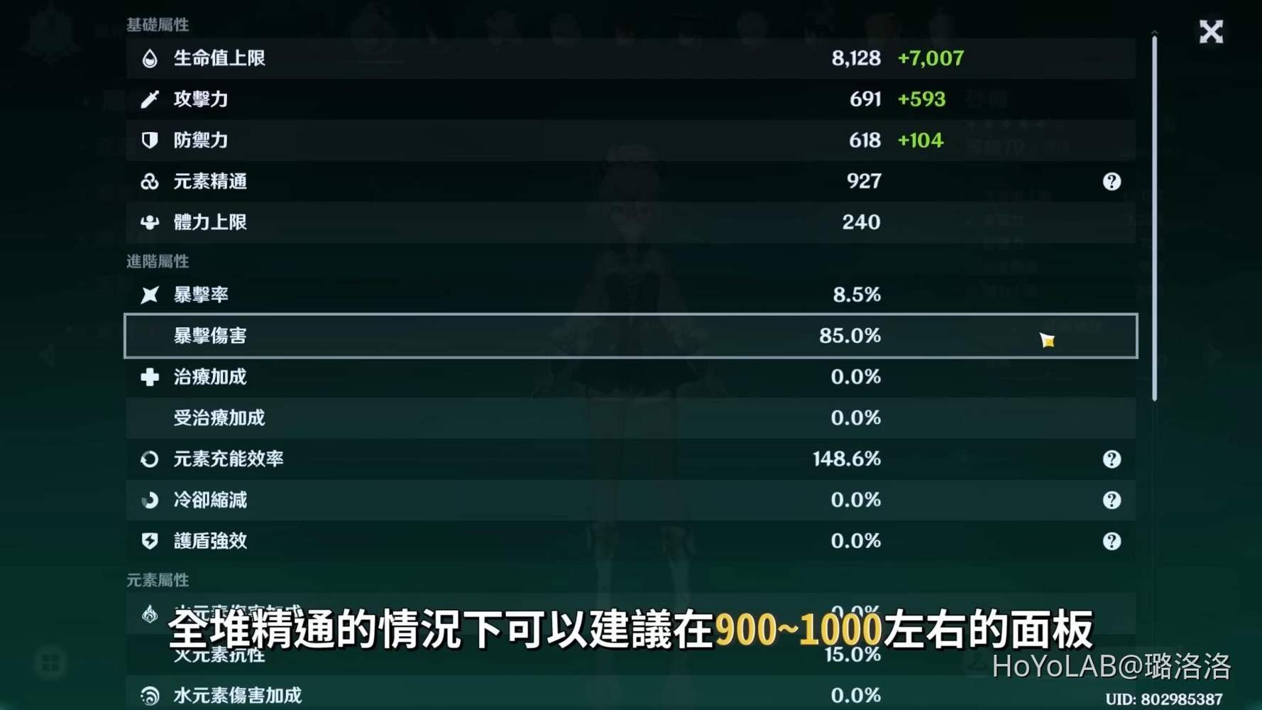 畢業面板參考,砂糖的主要訴求就是元素精通,越高越高,全堆精通的情況下可以建議在900~1000左右的面板,另外就是要看你的砂糖放在哪一種隊伍,假如砂糖是擔任武裝隊駕駛員的話,搭配祭禮殘章的情況下,元素充能可以落在140~160%左右,但若是放在純色隊或是永凍隊中的砂糖,就會需要要求砂糖的大招要跟上其他隊友的節奏,因此元素充能就會建議要在180%~200%以上,元素精通最好在750~800以上,也因為放在純色和永凍的關係,命座也最好也要能夠滿命,而如果面對的敵人陣容是可以一波帶走的話,也可以不用考慮元素充能。