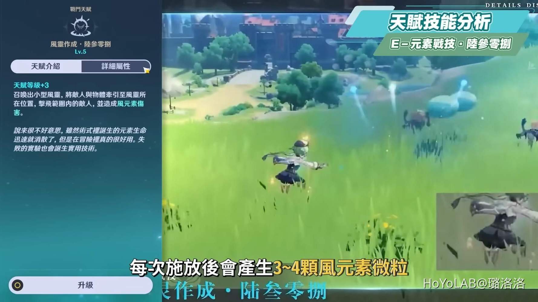 E技能是召喚一個小型風靈,稍稍將敵人往風靈的中心牽引,並造成風元素傷害,每次施放後會產生3~4顆風元素微粒,這個天賦的聚怪力道有點像是路上一陣風吹來,把女孩子的裙子吹起來、但又不至於把女孩子吹倒的感覺。