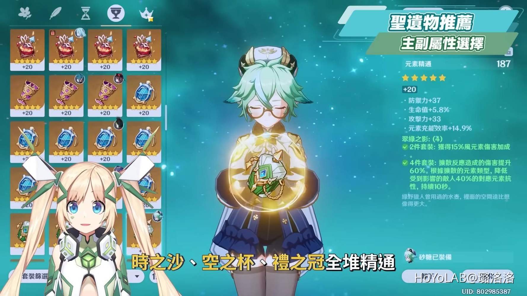 主副屬性選擇也是將時之沙、空之杯、禮之冠全堆精通,越高越好,若是覺得元素充能有卡的話也可以將時之沙換成元素充能沙。