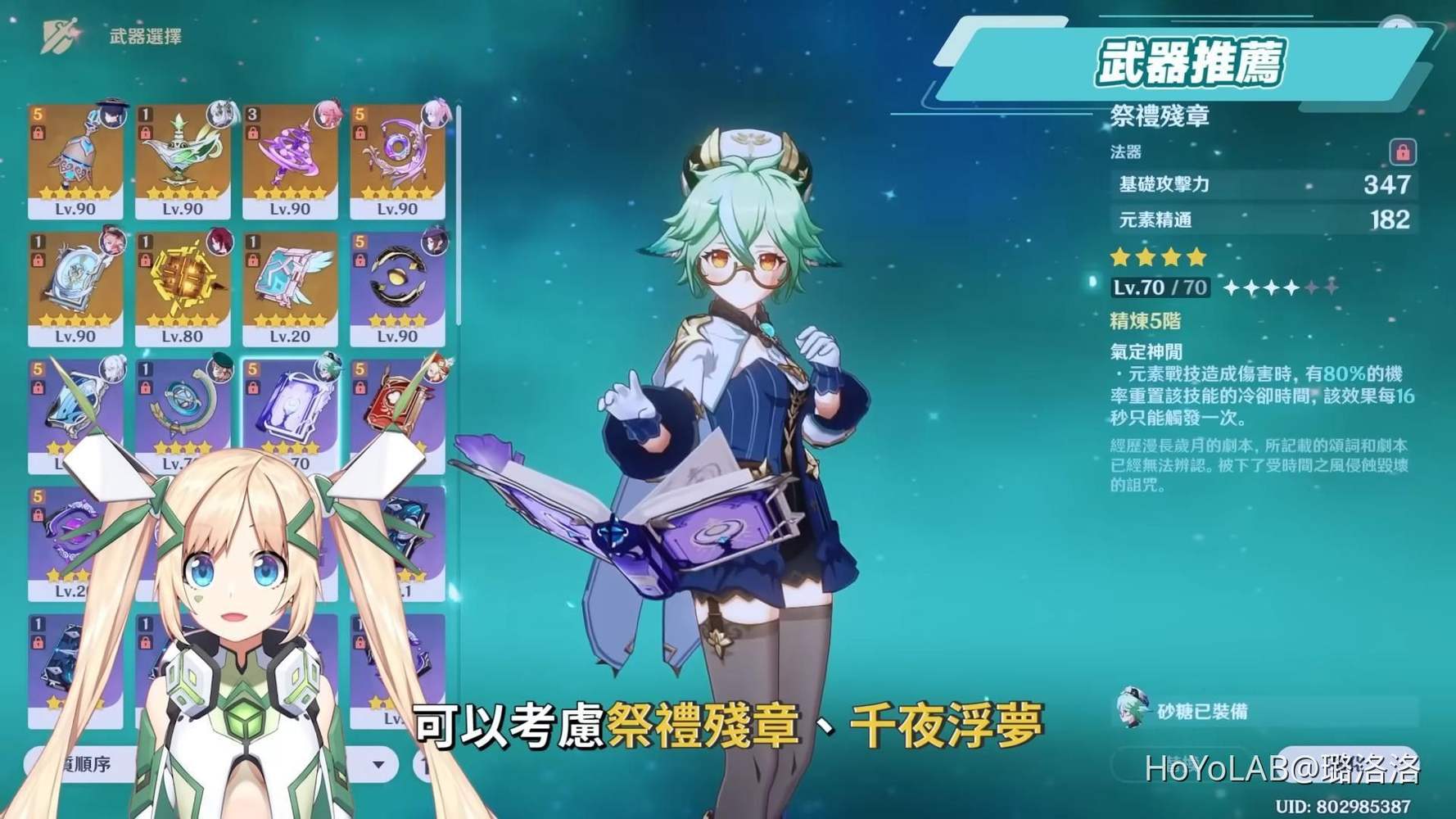 武器推薦部分,可以考慮元素精通或是元素充能相關的武器,放在吃元素精通的反應隊伍可以考慮祭禮殘章、千夜浮夢、流浪的晚星、萬國諸海圖譜、魔導緒論、西風秘典,隊伍中有雷元素角色可以穿白辰之環,若是放在永凍隊中的話也可以繼續拿祭禮殘章、或是西風秘典提升充能、滿精煉討龍書增加攻擊等。