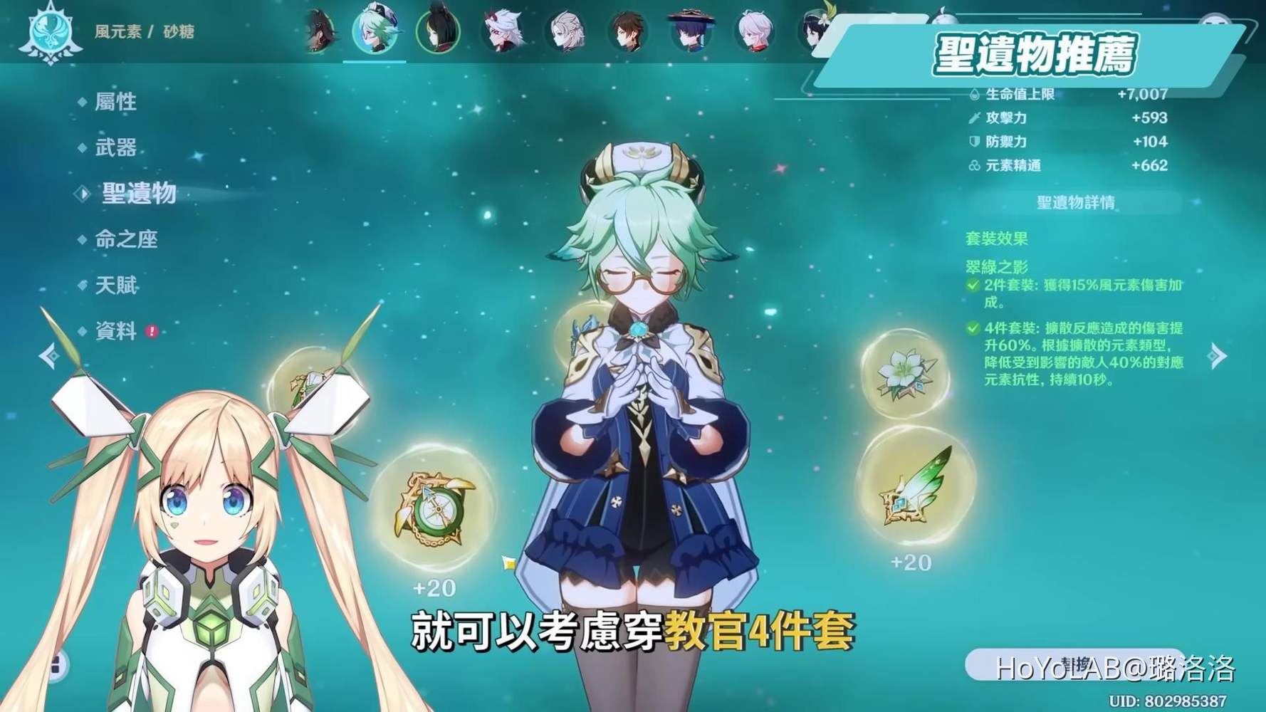 聖遺物推薦部分,大多數情況下只有一種最優解就是風套4件,除非將砂糖放在一些草元素相關的隊伍中,例如主打蔓激化、綻放相關的隊伍時,就可以考慮穿教官4件套。