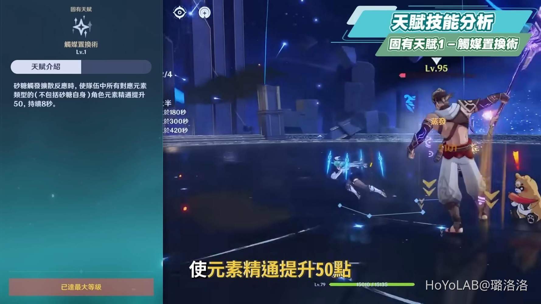 解鎖固有天賦2,只要在E和Q命中敵人時,將會基於砂糖自身元素精通的20%,提供元素精通加成給隊伍中所有隊友,不包含砂糖自己。而若是砂糖在過程中吃到固定數值的精通加成,還可以再增加到轉化的元素精通的基數中,給隊友帶來更多的元素精通提升。