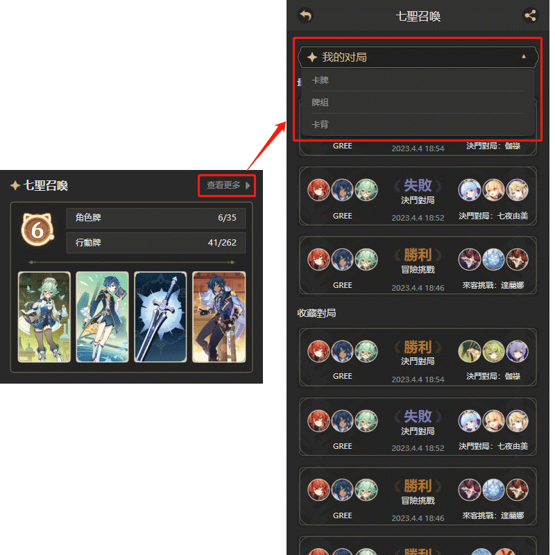 點擊【查看更多】或下方卡牌,可查詢七聖召喚對局紀錄