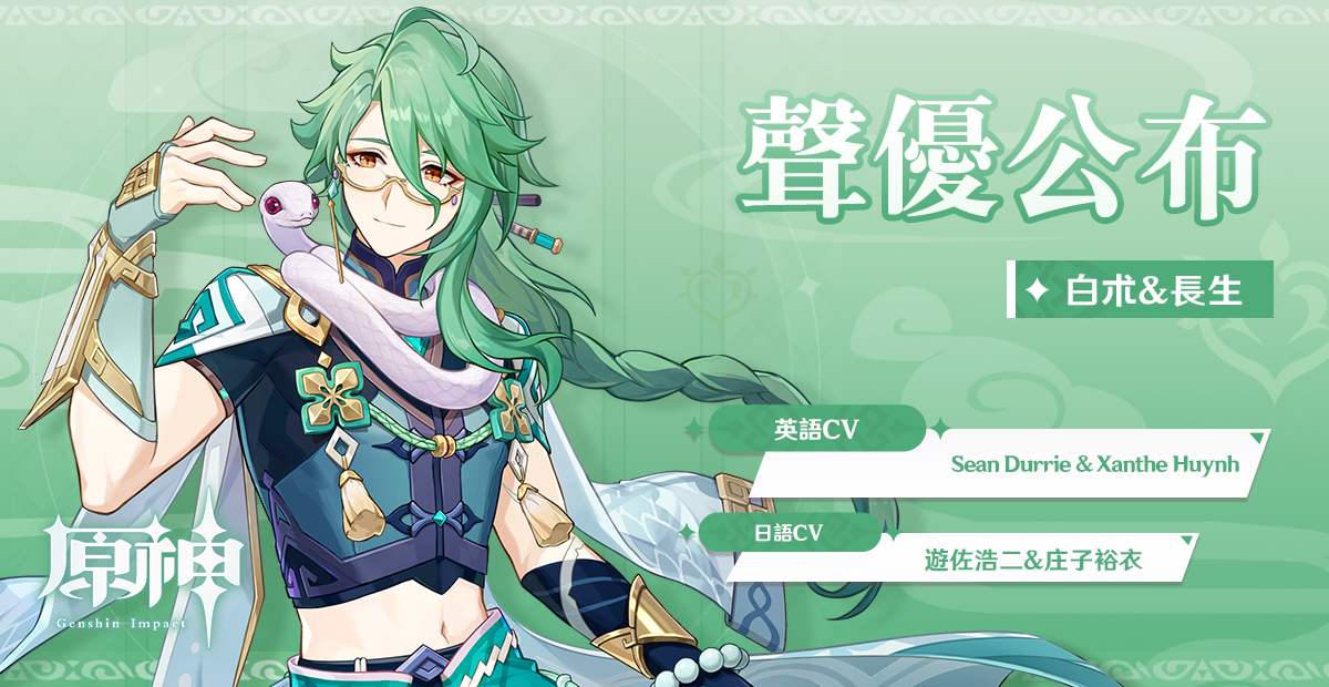 標籤:3.6 CV Genshin Impact Sean Durrie Xanthe Huynh 原神 庄子裕衣 白朮 聲優公布 角色 遊佐浩二 遊戲官方公告 配音演員