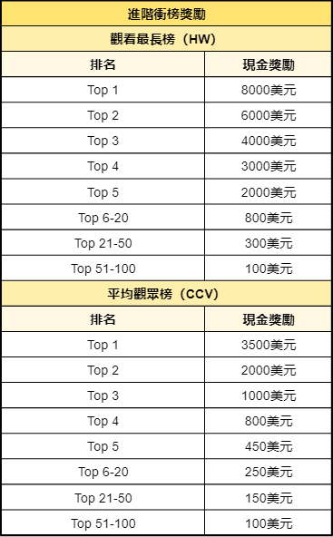 *「觀看最長榜」與「平均同時線上觀眾榜」的獎勵可以同時獲得,兩個排行榜的排名將會分開統計